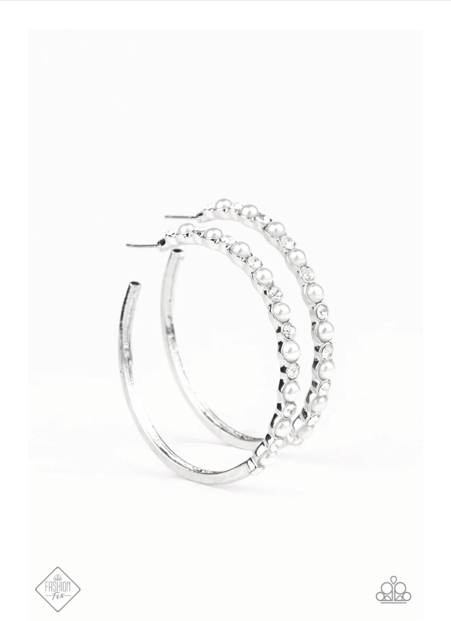 The front edge of a glistening silver hoop is decorated in a refined collection of tiny white pearls and glassy white rhinestones for a sophisticated finish. Earring attaches to a standard post fitting. Hoop measures approximately 2" in diameter.
