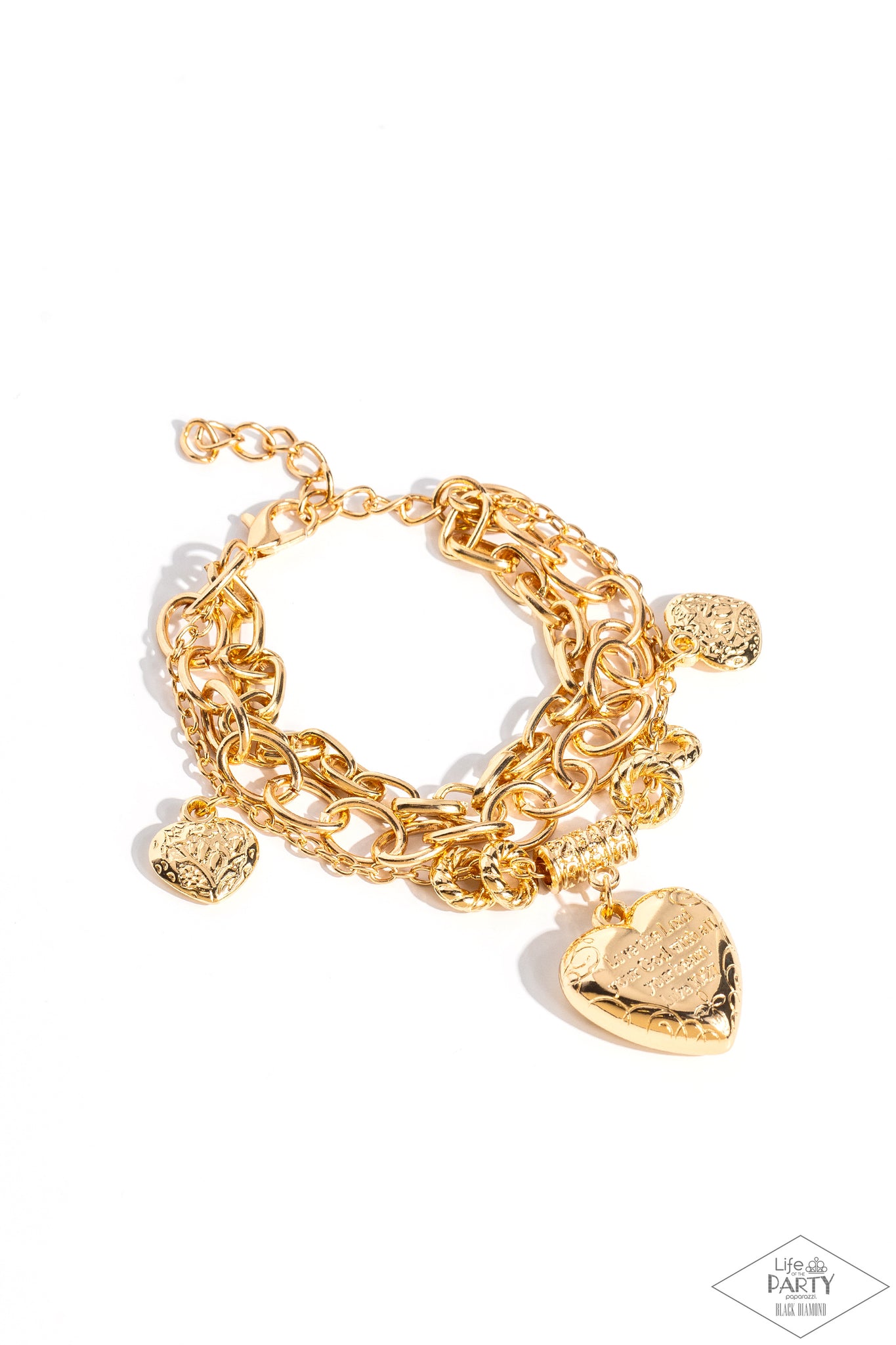 A collection of gold hearts and gold rings combine with a larger heart charm adorned in a feminine floral pattern. The heart charm is inscribed with the phrase, "With All My Heart," on one side and a short bible verse on the other that reads, "Love the Lord your God with all your heart. Luke 10:27." Features an adjustable clasp closure.