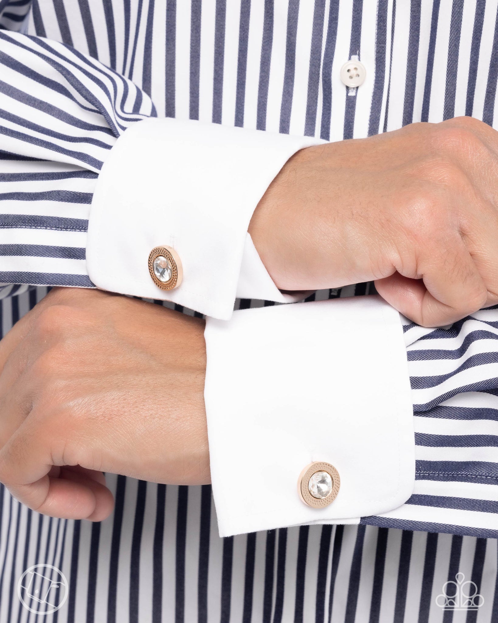 A faceted white gem is pressed into the center of a stud-layered gold frame for a classic cuff link.