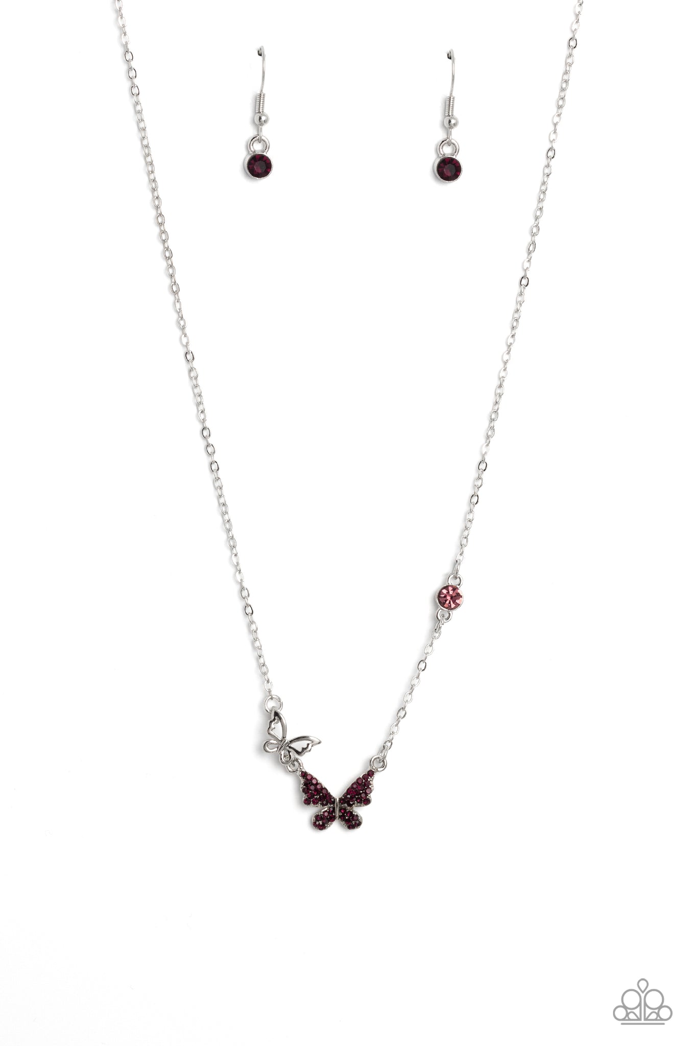 A silver butterfly, dotted in dainty amethyst rhinestones, hangs from the bottom of a dainty silver chain. A smaller, airy silver butterfly appears to be in mid-flight as it's tilted to its side and begins to climb up the dainty chain, next to the amethyst-dotted butterfly. A light amethyst rhinestone is infused on the other side of the purple butterfly, further climbing up the chain, providing a whimsical finishing touch to the lighthearted design. Features an adjustable clasp closure.