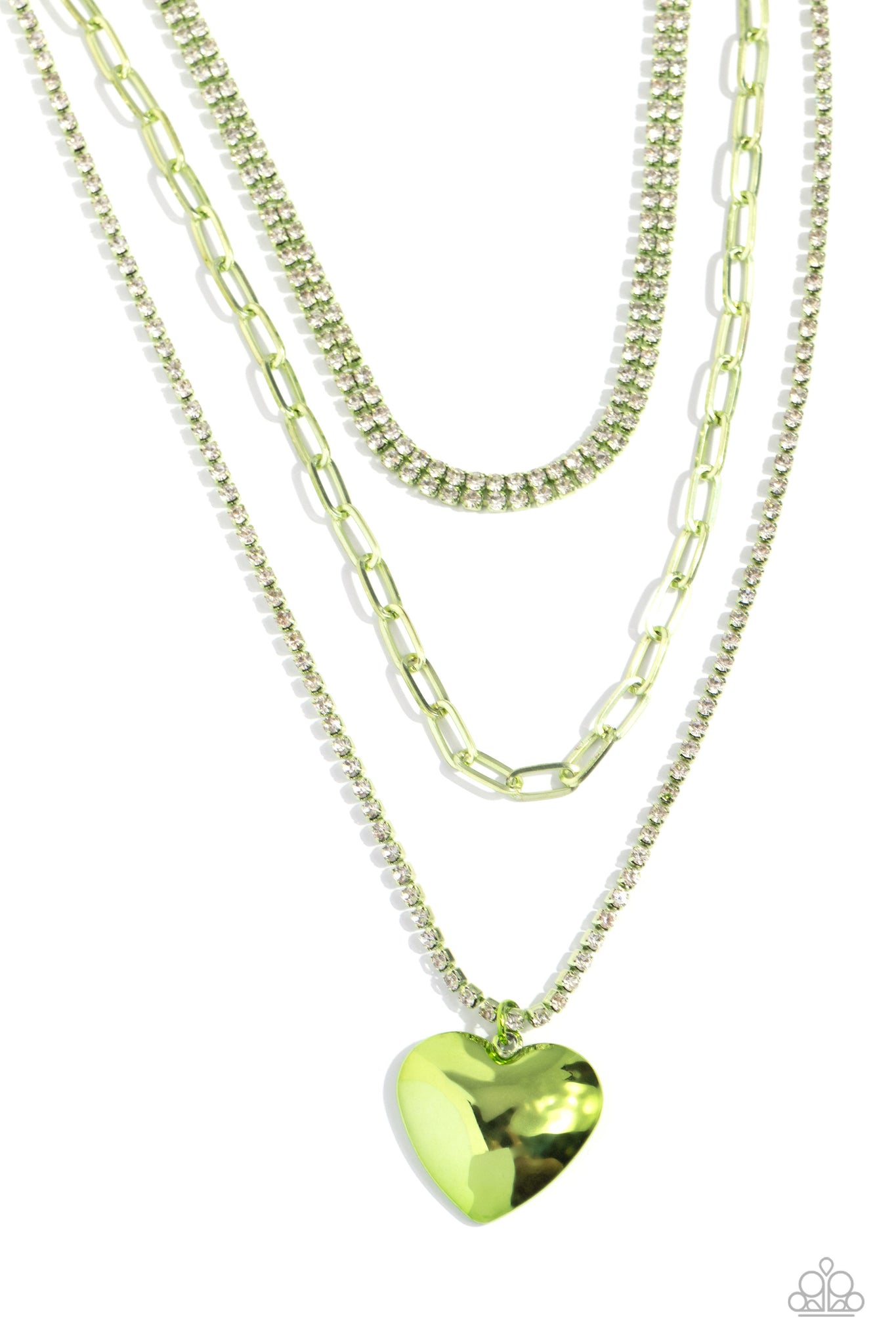 Featuring a green-painted hue, a trio of paperclip, rhinestone-encrusted box chain, and layered rhinestone-encrusted box chains coalesces down the neckline for a monochromatic masterpiece. Strung on the lowermost green box chain, a green heart pendant stands out and reflects light in every direction for a statement finish. Features an adjustable clasp closure.