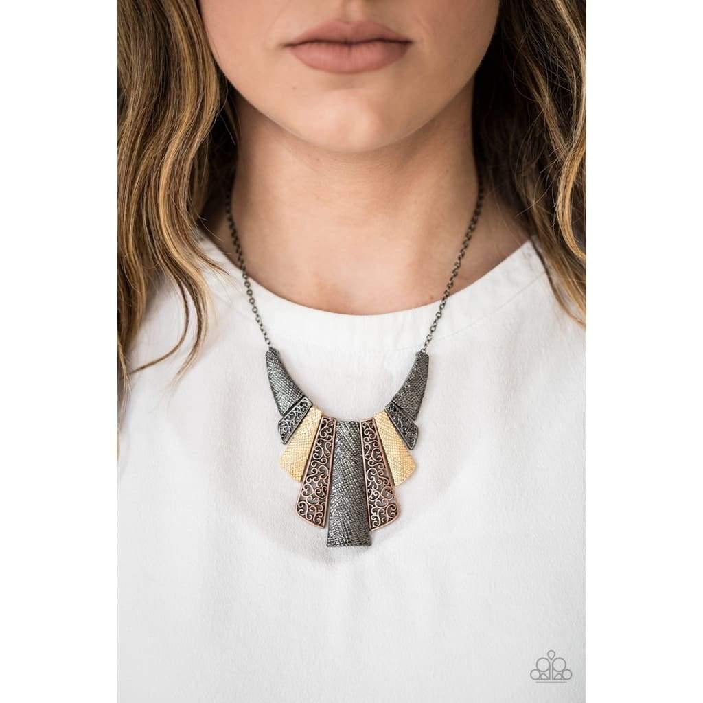Gunmetal, gold, and copper plates featuring various hammered and filigreed textures swing from the bottom of a dainty gunmetal chain. The gorgeous tribal fringe fans out below the collar in a dramatic statement piece. Features an adjustable clasp closure.