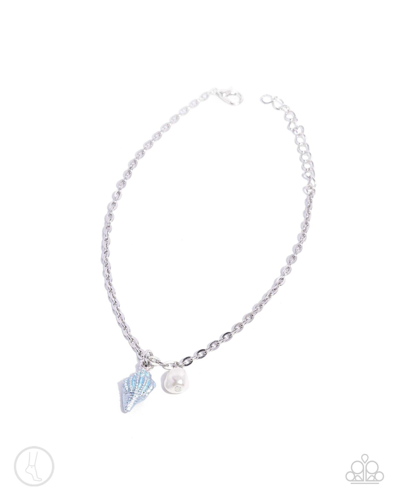 Featuring reflective light blue paint, a conch shell charm, and baroque white pearl dance along a dainty silver cable chain along the ankle for a coastally chic look. Features an adjustable clasp closure.