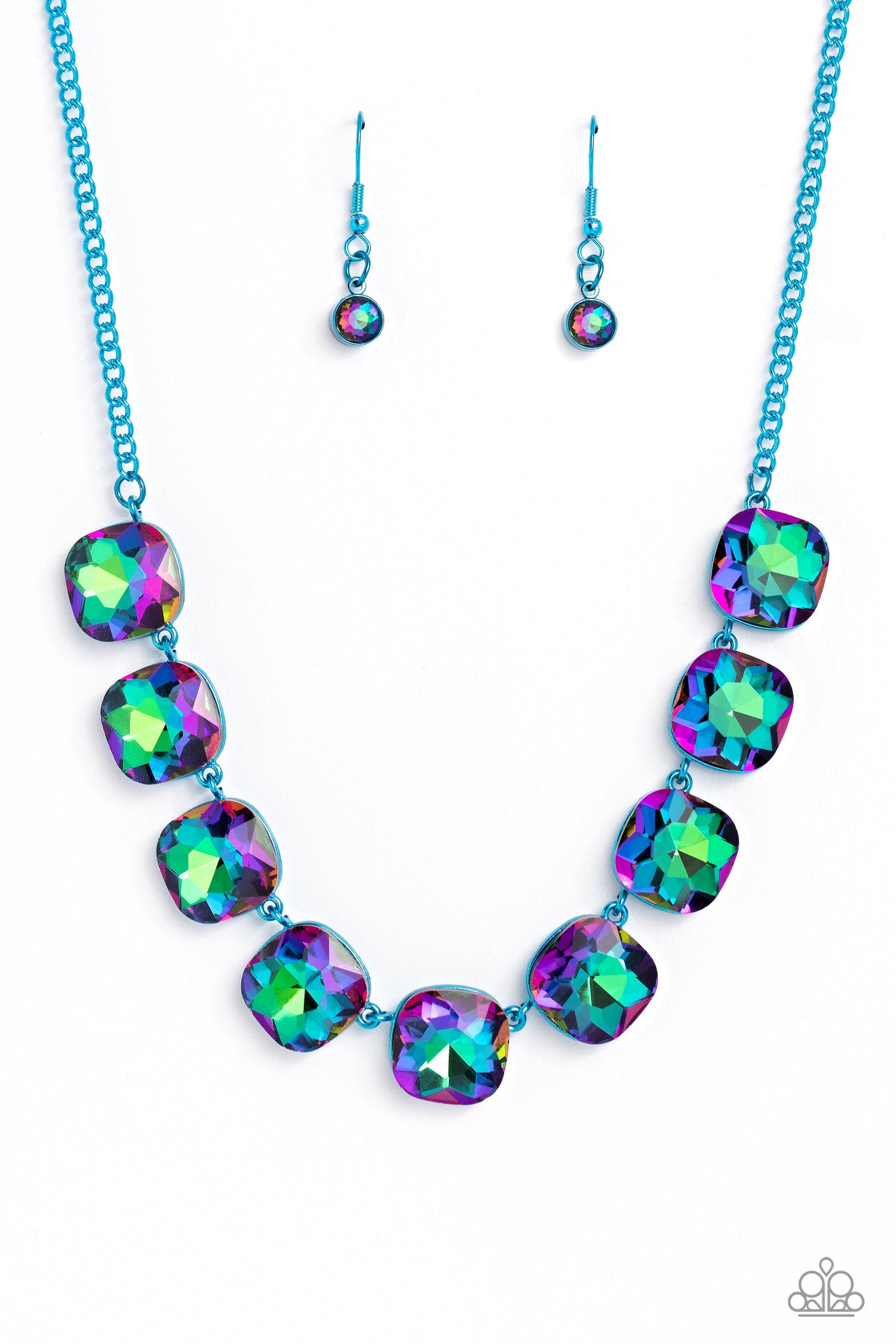 Featuring a vivacious blue chain, a collection of UV shimmery cushion-cut gems, pressed in vibrant blue frames, coalesces around the collar to create a playful pop of color. Features an adjustable clasp closure.