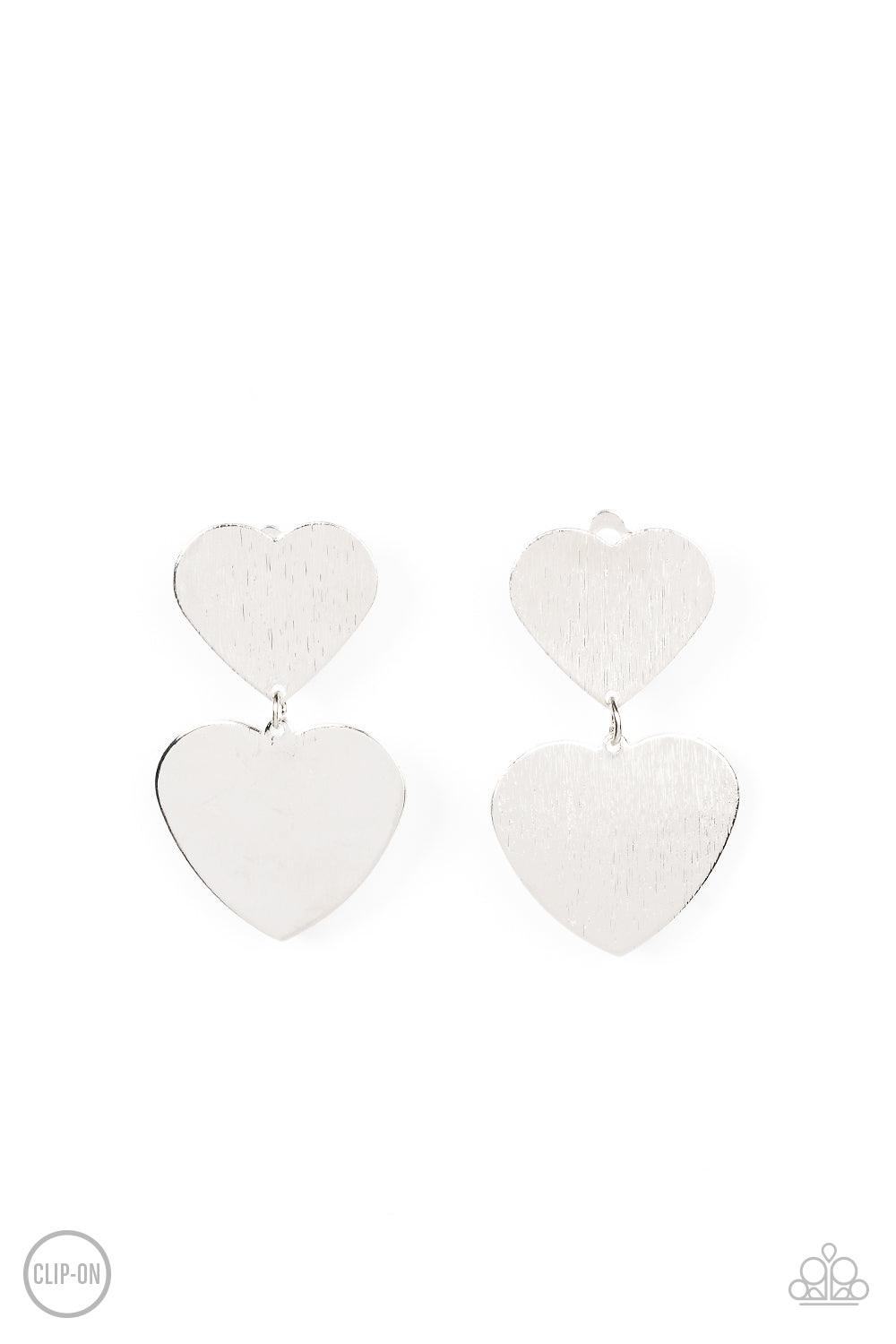 Featuring a shimmery scratched finish, an oversized silver heart charm swings from the bottom of a smaller silver heart charm, resulting in a flirtatious lure. Earring attaches to a standard clip-on fitting.