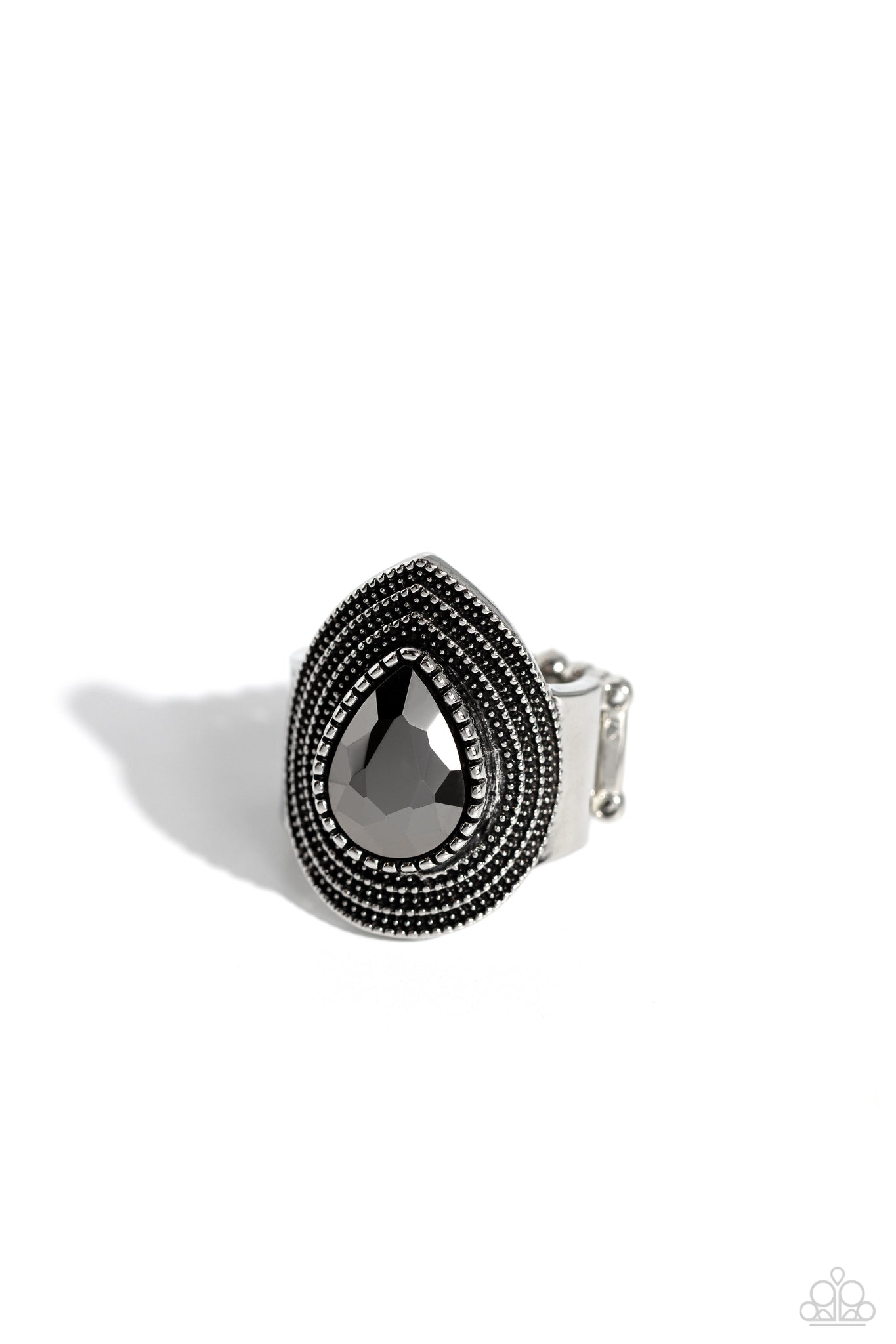 A faceted hematite teardrop gem is nestled inside a silver teardrop frame radiating with studded, layered textures, resulting in an edgy centerpiece atop the finger. Features a stretchy band for a flexible fit.