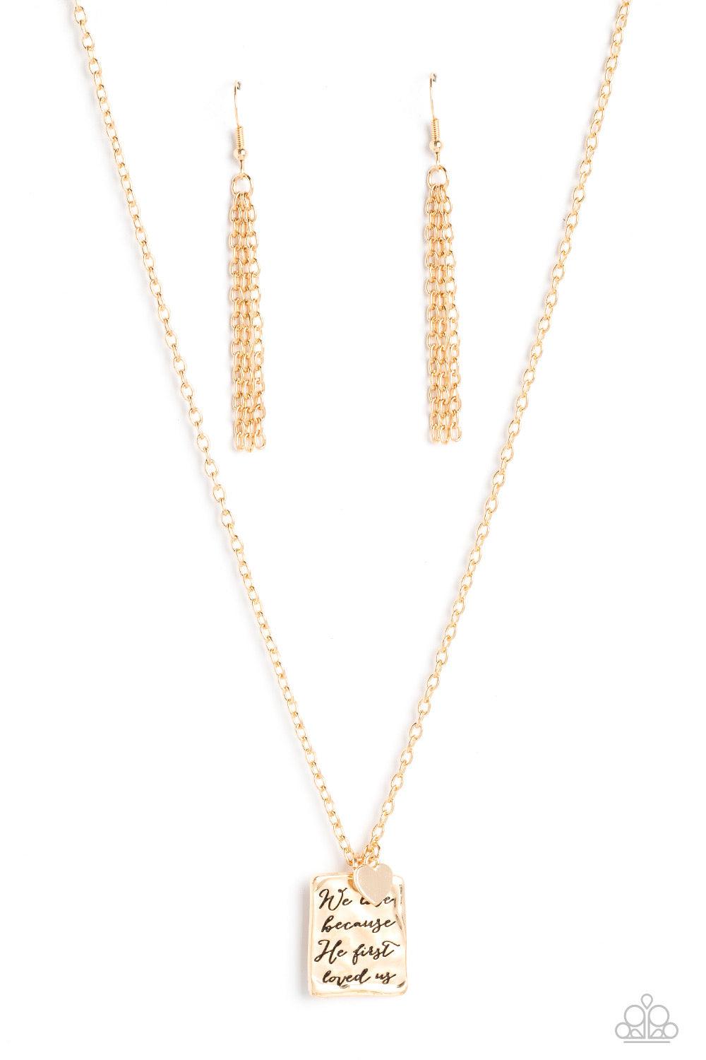 Dangling from a delicate gold chain, a hammered rectangular plate swings for eye-catching movement. The religious phrase "We love because he first loved us" prominently stands out in the center, in an antiqued font. A gold heart charm glides just above the rectangular plate for a vintage-inspired finish. Features an adjustable clasp closure.