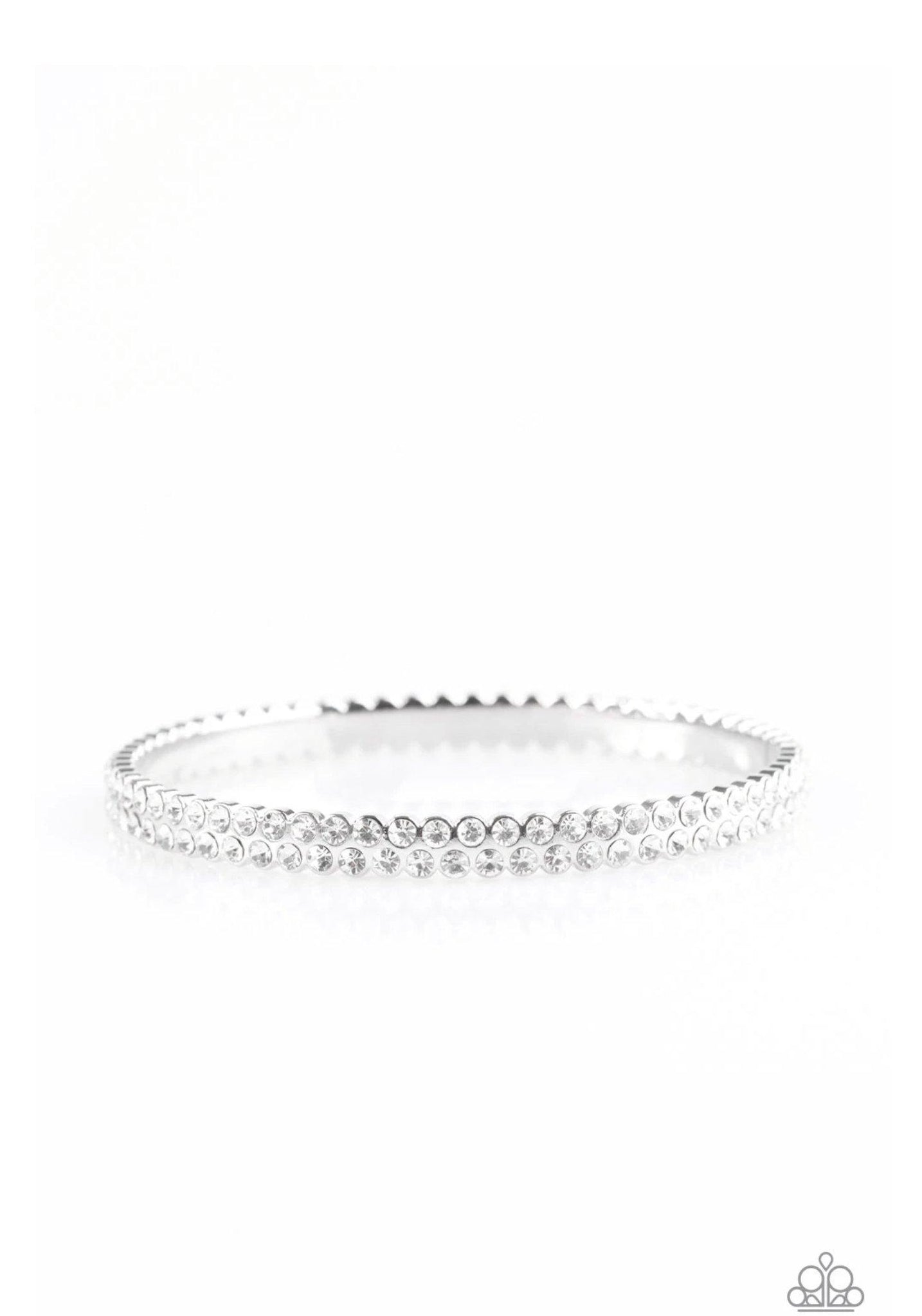 Two rows of glassy white rhinestones are encrusted along a thick silver bangle for a timeless look.
