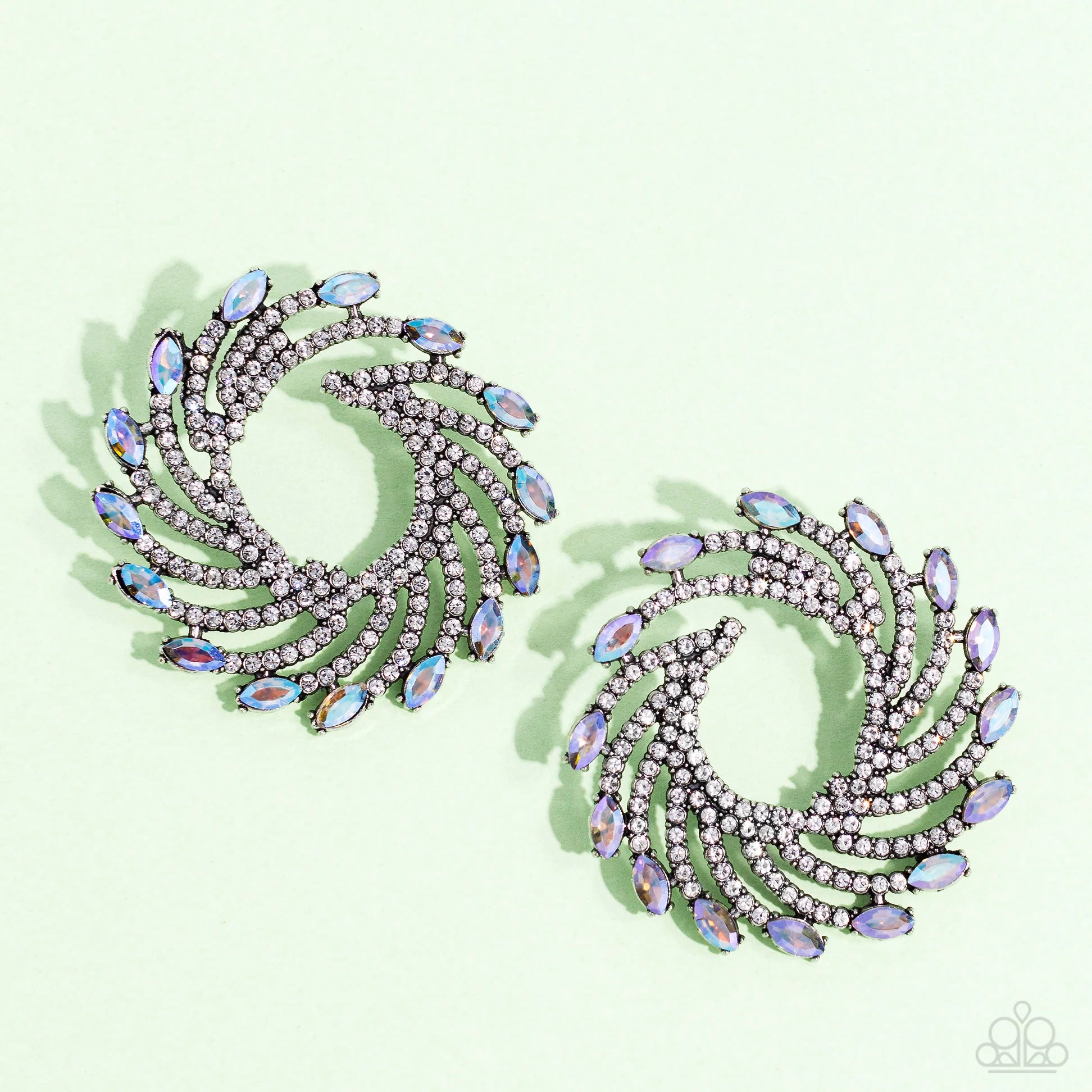Shimmery strands of silver spin out from an airy center, creating an exaggerated firework-like display at the ear. An explosion of dainty white rhinestones lines the swirls and curves of the shimmery display leading the eye to the collection of colorfully reflective marquise-cut gems at its ends. Each colorfully reflective marquise-cut gem curls around the ear in a clock-like manner, creating additional eye-catching dimension. Earring attaches to a standard post fitting. Due to its prismatic palette, color may vary.