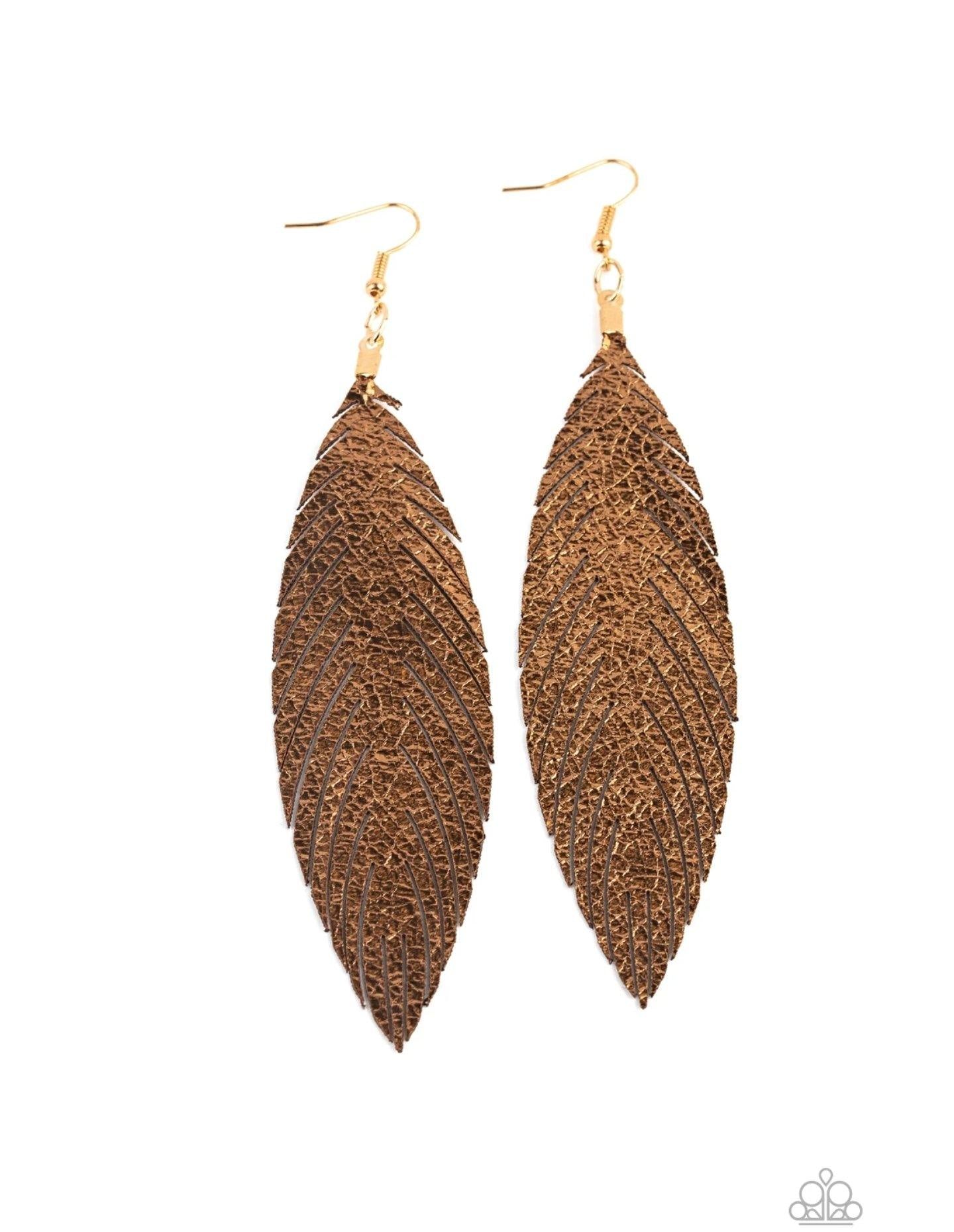 Brushed in a golden metallic finish, a flat leather feather frame swings from the ear for a statement-making finish. Earring attaches to a standard fishhook fitting.