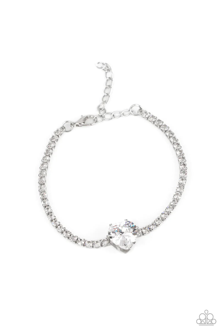 An oversized white heart-shaped gem, set in an airy, pronged silver fitting, glitters at the center of a blinding row of dainty, glassy white rhinestones set in square silver fittings, resulting in a flirtatious sparkle around the neckline. Features an adjustable clasp closure.