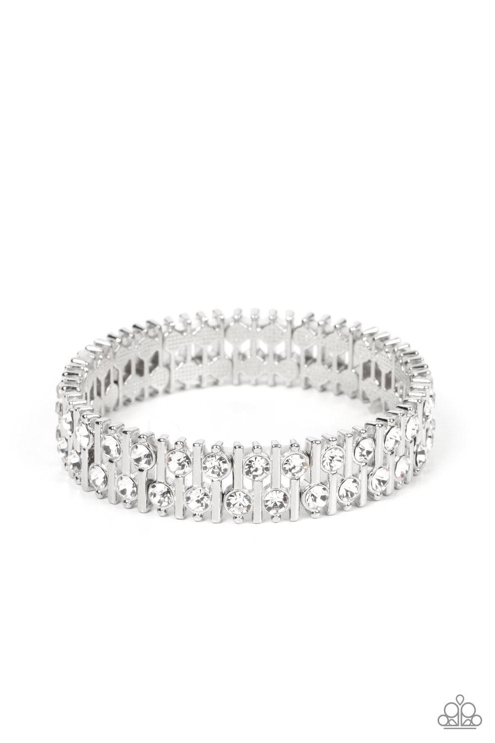 Attached to silver bars, a staggered display of solitaire white rhinestones alternates along a stretchy band around the wrist for an unexpected pop of shimmer around the wrist.
