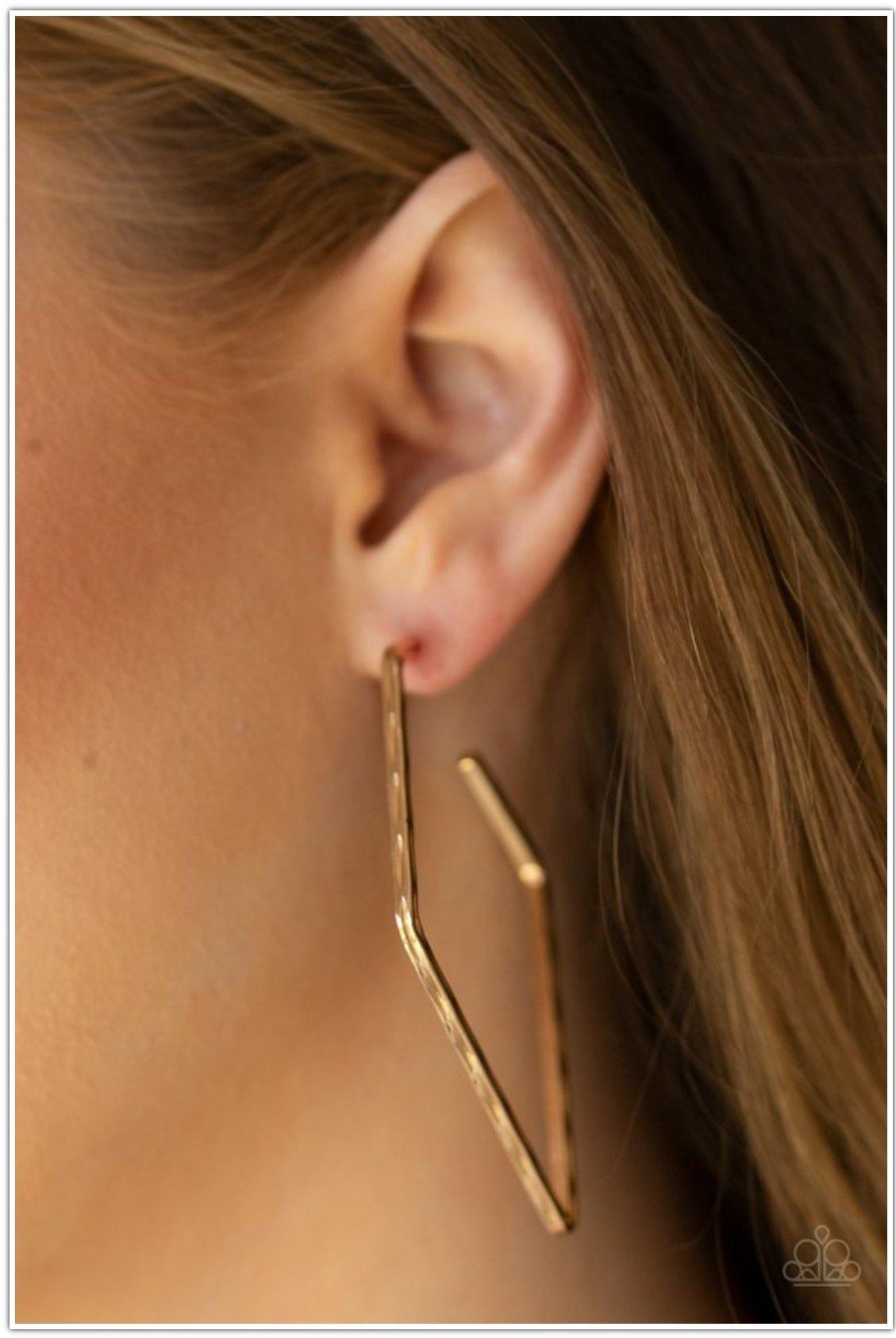 Delicately hammered in endless shimmer, a glistening gold bar bends into an edgy kite-like hoop for a radical fashion. Earring attaches to a standard post fitting. Hoop measures approximately 1 3/4" in diameter.
