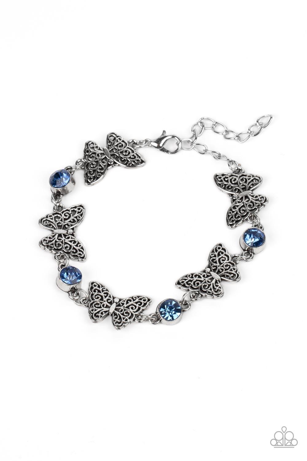 Featuring filigree filled wings, dainty silver butterflies alternate with blue rhinestones around the wrist for a whimsical sparkle. Features an adjustable clasp closure.