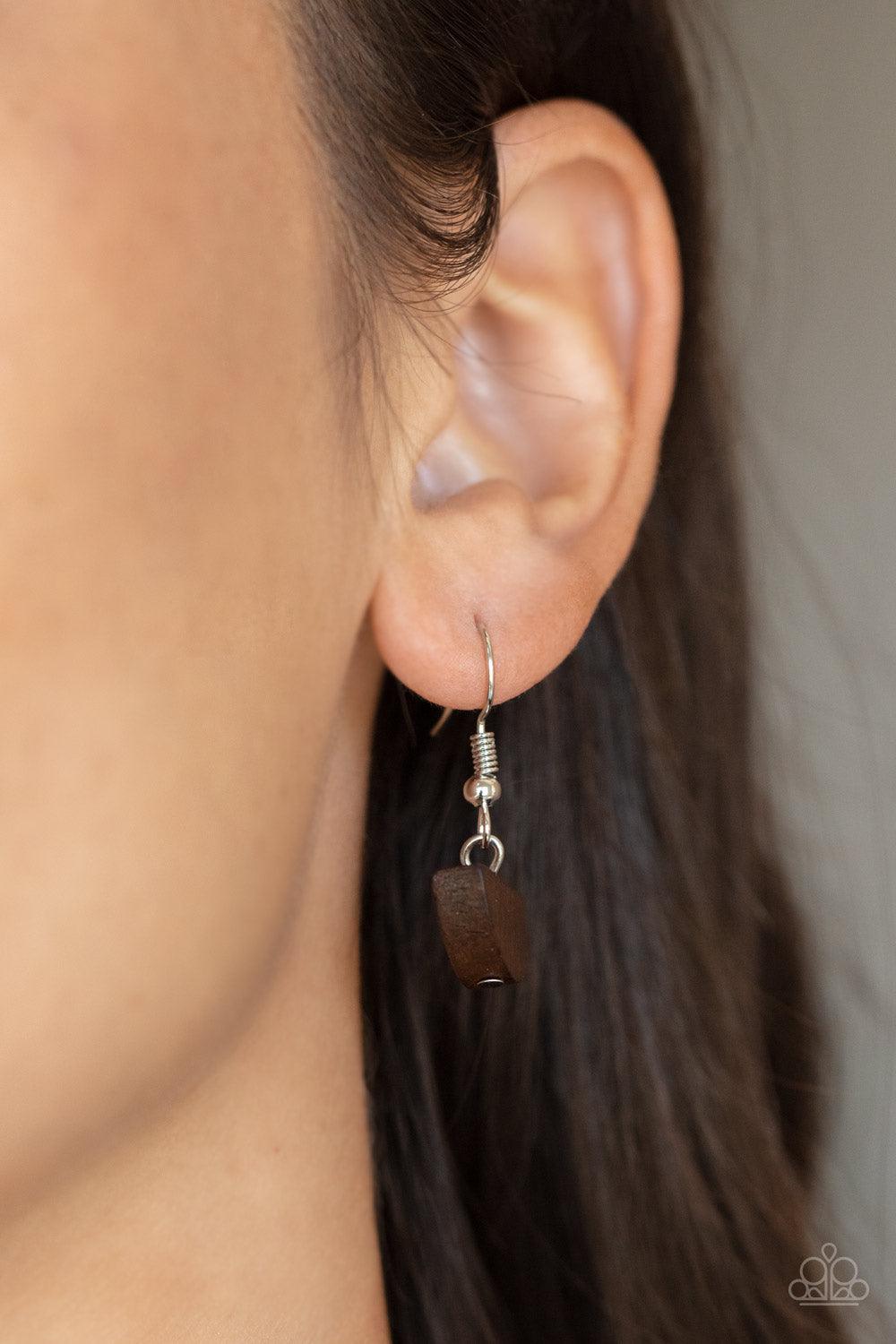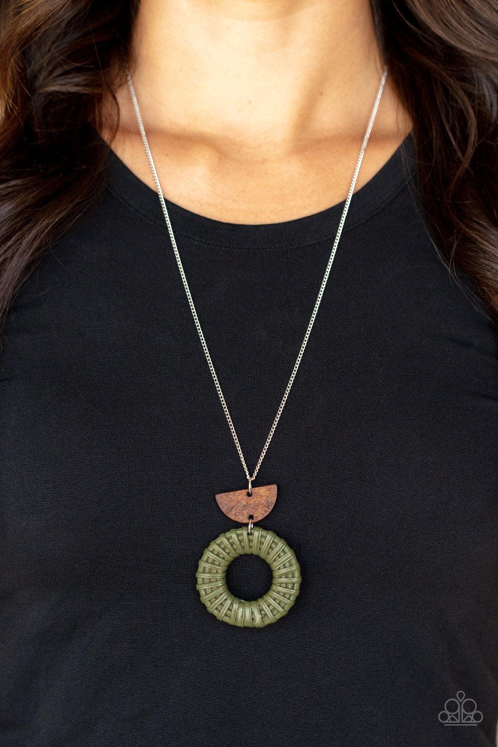 Green wicker-like cording wraps into a rustic hoop at the bottom of a half-moon wooden frame. The earthy stacked pendants swing from a lengthened silver chain, creating an artisan-inspired display. Features an adjustable clasp closure.