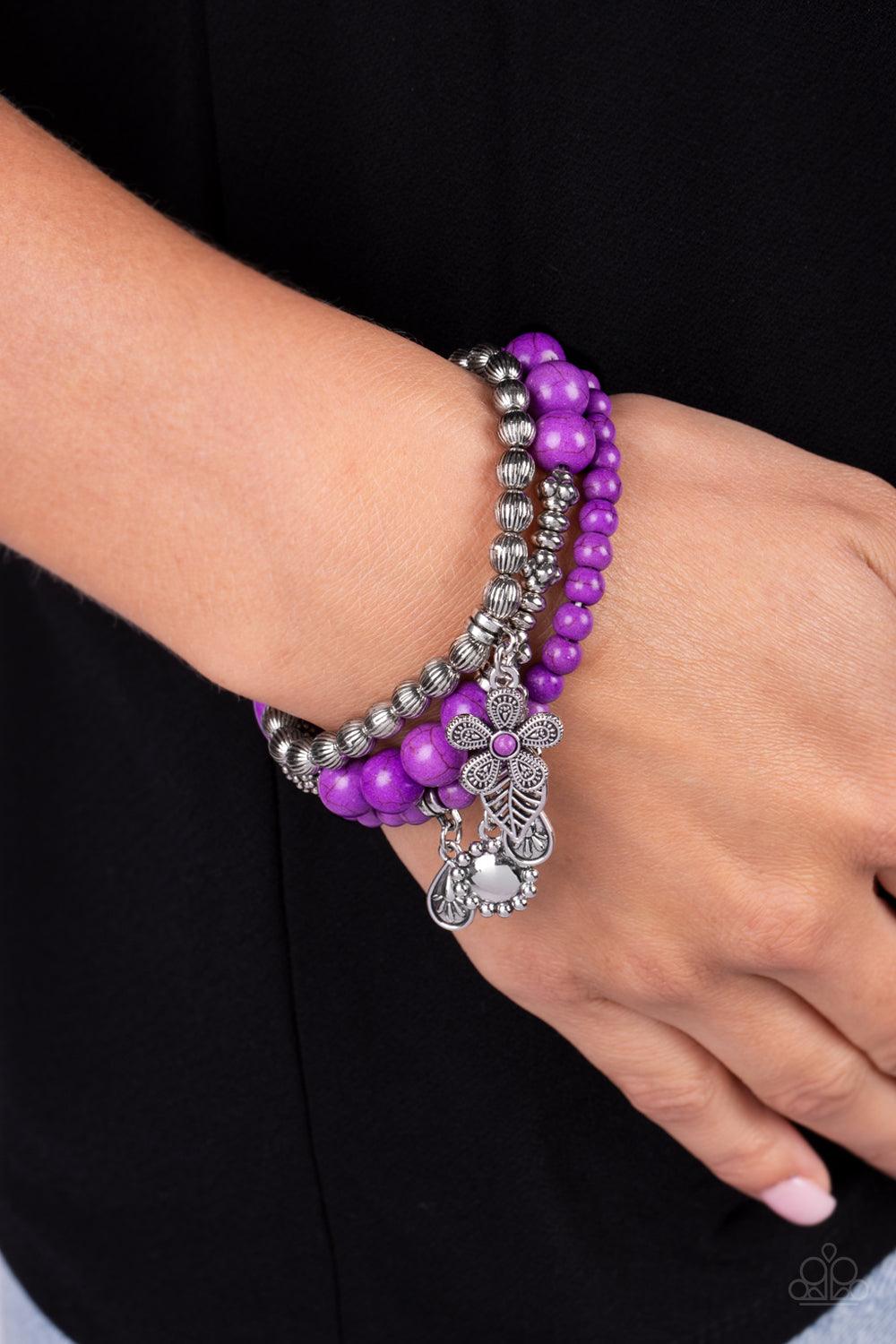 A trio of floral-inspired bracelets, featuring comfortable stretchy bands and smooth purple stones, stack along the wrist to create a bold statement piece. One bracelet is formed from a strand of linearly-textured silver beads, leading to a single silver flower charm topped with a tiny purple stone. A strand of purple stones creates another bracelet that is adorned with three silver charms — two teardrops embossed with small flowers, and a polished disc bordered by silver studs. The final bracelet features sections of purple stones separated by textured silver accents, with a single airy leaf charm adding playful movement to the piece. As the stone elements in this piece are natural, some color variation is normal.