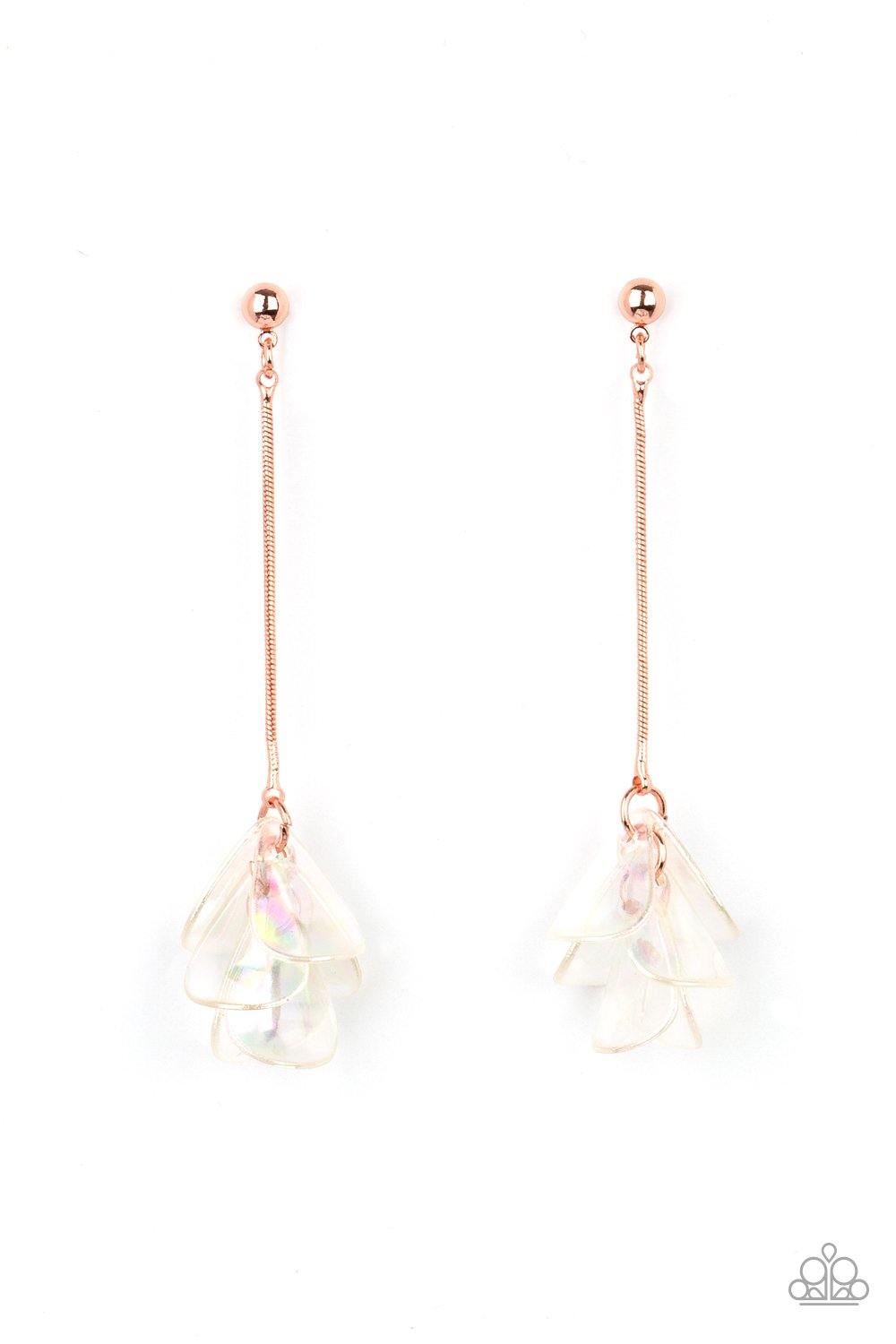 Iridescent acrylic petals delicately cluster at the bottom of a shiny copper chain, creating an ethereal tassel. Earring attaches to a standard post fitting.