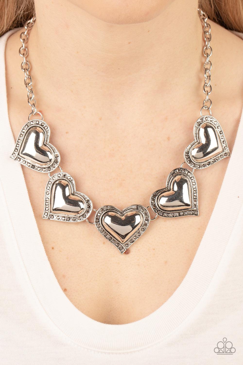 Bordered in glitzy hematite rhinestones, an oversized collection of beveled silver heart frames delicately links below the collar for a dramatically romantic look. Features an adjustable clasp closure.