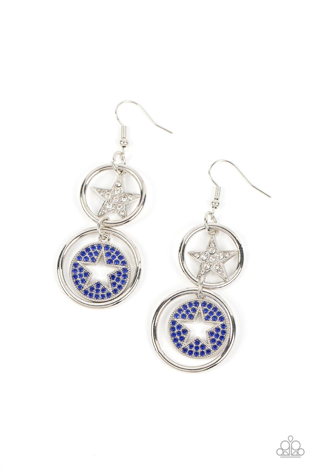 Two silver hoops link into a stacked lure. A white rhinestone encrusted silver star twinkles from the uppermost hoop, while a blue rhinestone dotted silver frame featuring an airy star cutout sparkles from the bottom for a stellar finish. Earring attaches to a standard fishhook fitting.
