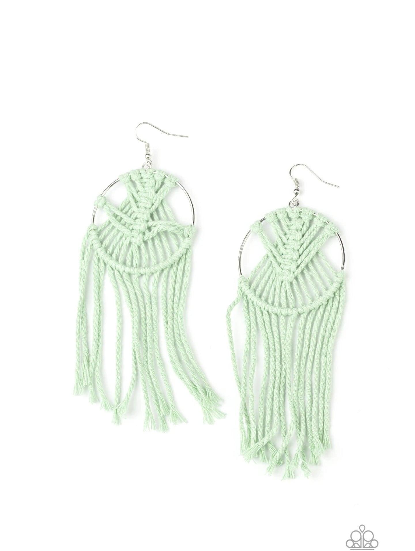 Soft minty green twine is decoratively knotted around a silver hoop, creating a trendy tassel. Earring attaches to a standard fishhook fitting.