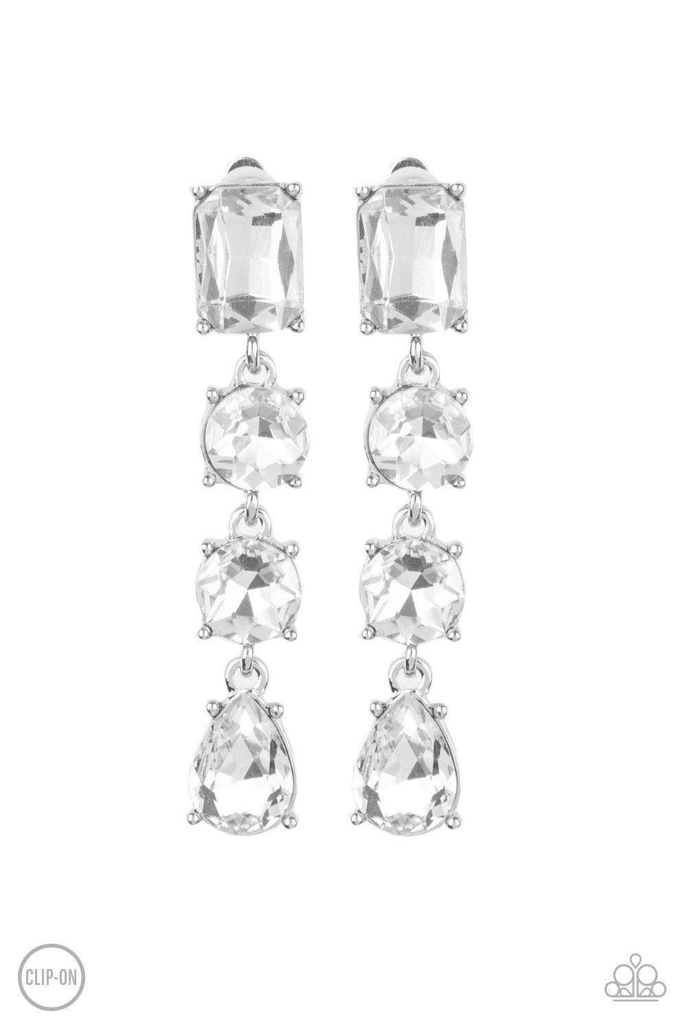 Featuring a glassy white finish, a collection of emerald, round, and teardrop cut rhinestones drip from the ear, connecting into a glamorous lure. Earring attaches to a standard clip-on fitting.
