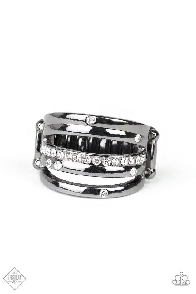 Dainty white rhinestones are sporadically sprinkled across rows of shiny gunmetal bands abstractly layered across the finger for a refined twist. Features a stretchy band for a flexible fit.