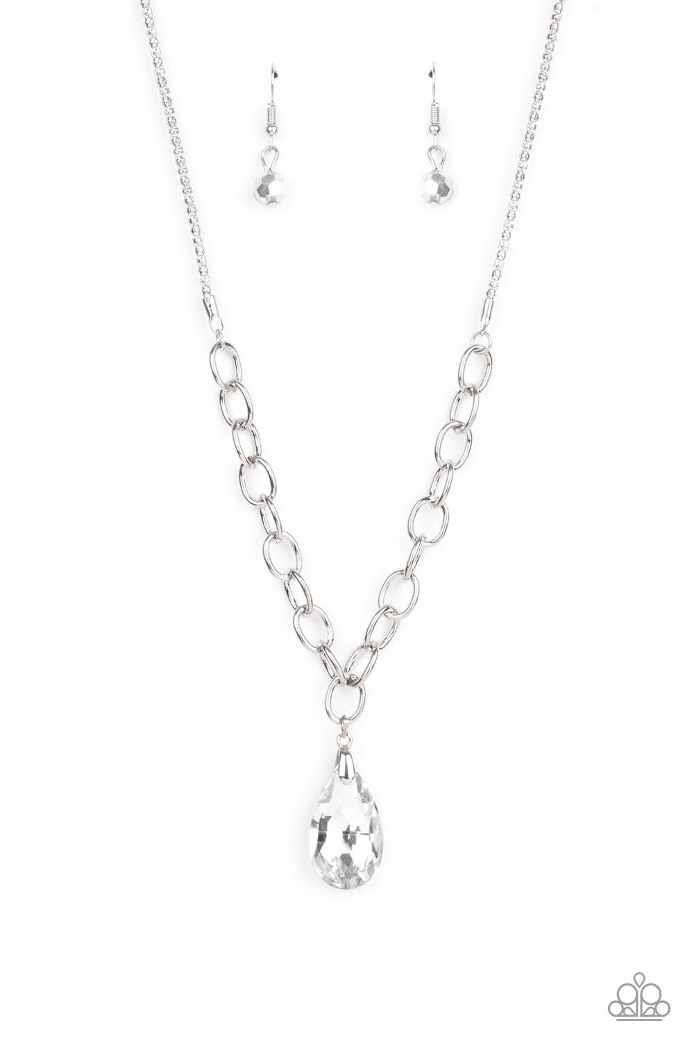 A glassy white teardrop swings from the bottom of a chunky silver chain that attaches to a shimmery silver popcorn chain, creating a modern display below the collar. Features an adjustable clasp closure.