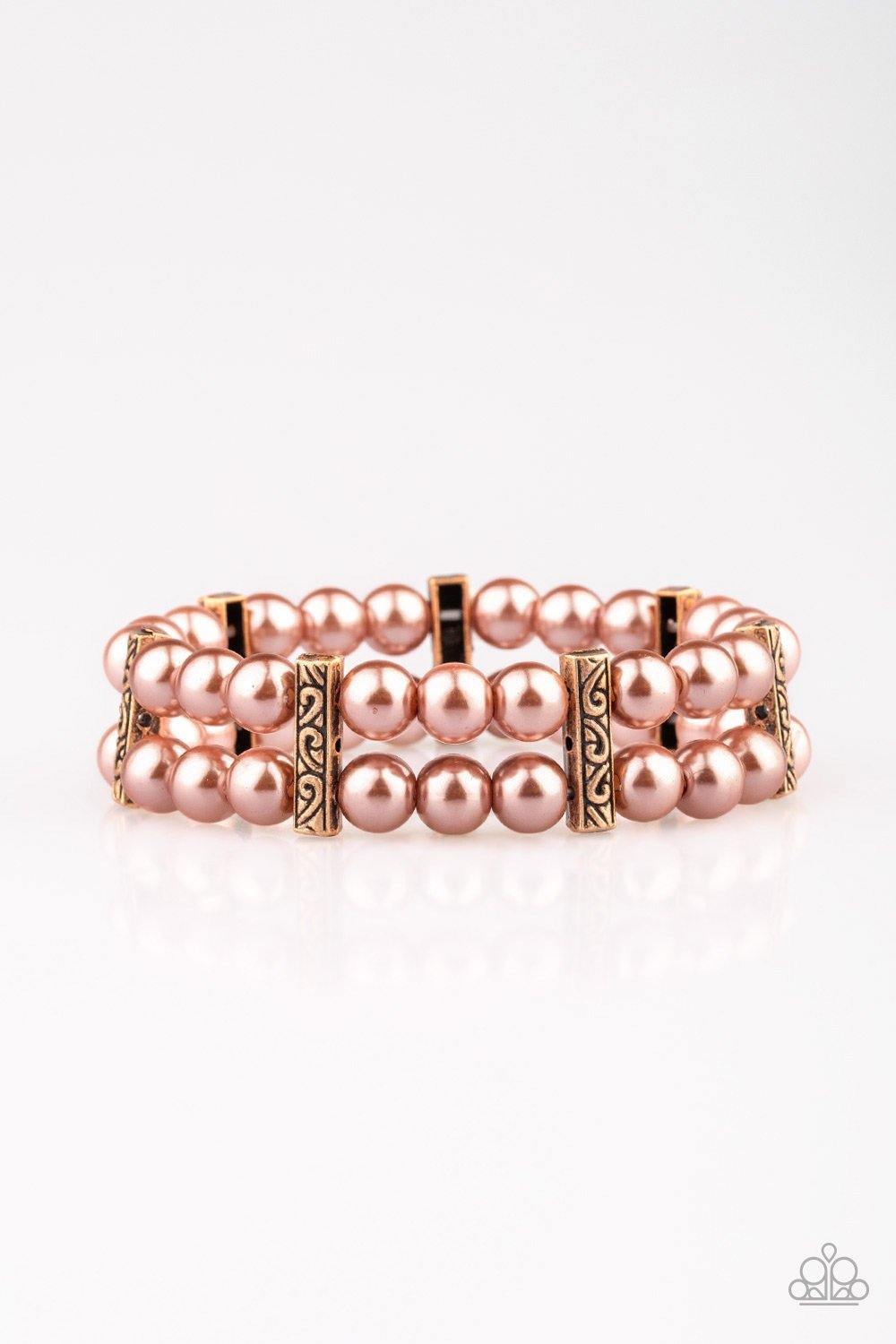Joined together by decorative copper fittings, pairs of coppery pearls are threaded along stretchy bands around the wrist, coalescing into a timeless bracelet.
