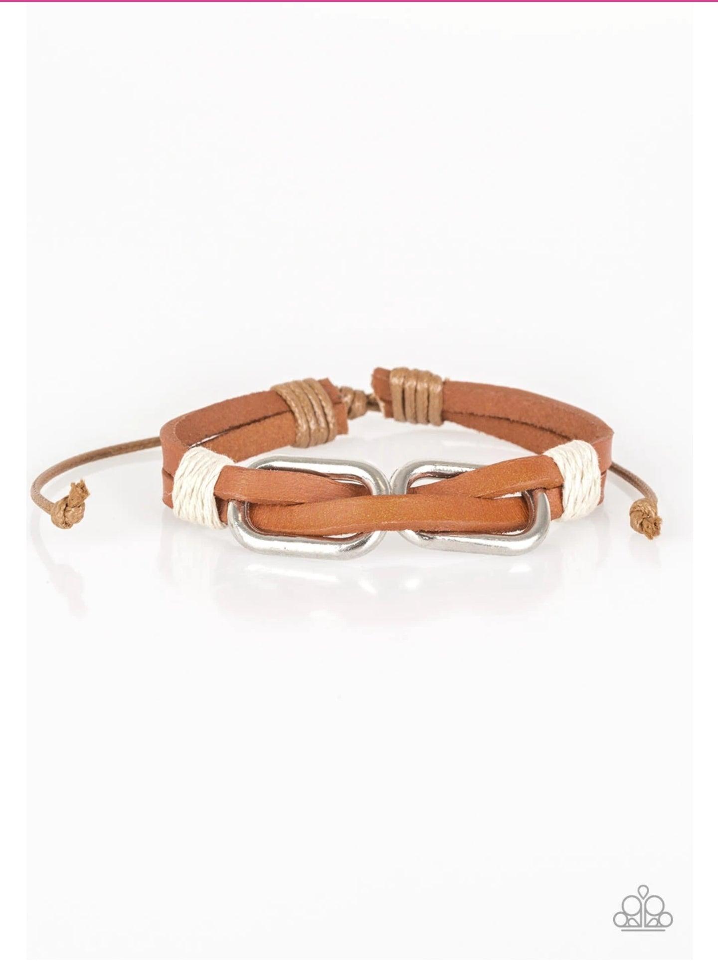 Infused with white cording, strips of brown leather lace through silver links for an adventurous look. Features an adjustable sliding knot closure.