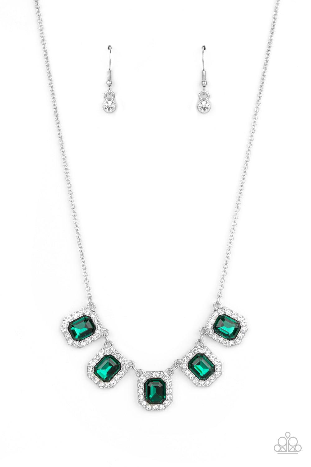 Bordered in glassy white rhinestones, verdant green emerald style rhinestone encrusted frames gorgeously link below the collar for a timeless fashion. Features an adjustable clasp closure.
