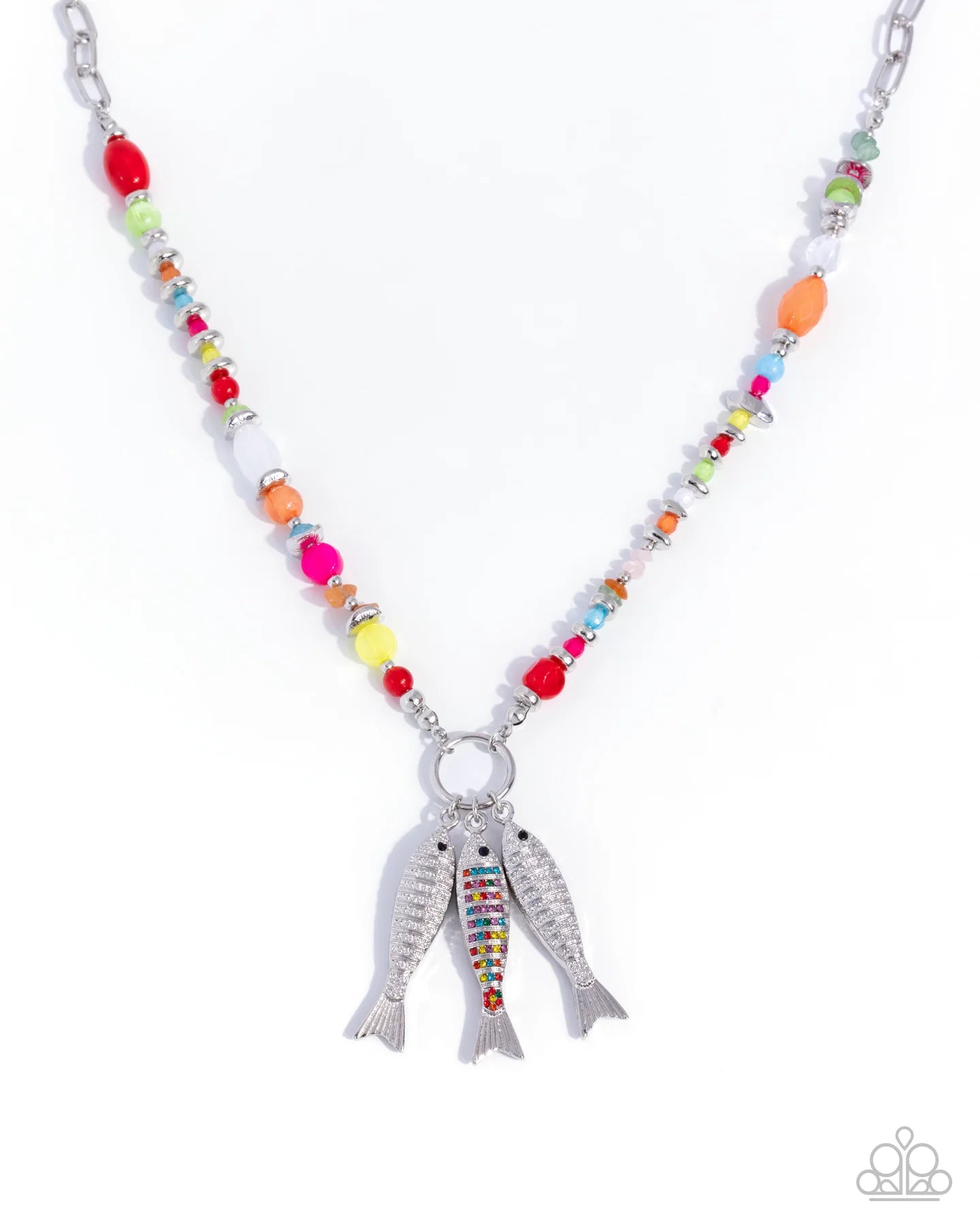 Infused along a silver paperclip chain, a collection of milky acrylic beads in varying shapes, sizes, and colors, patterns below the neckline beside silver beads and discs, leading the eye to a silver ring where a trio of silver fish is dotted with multicolored and white rhinestones for a sensationally sea-inspired fringe. Features an adjustable clasp closure.