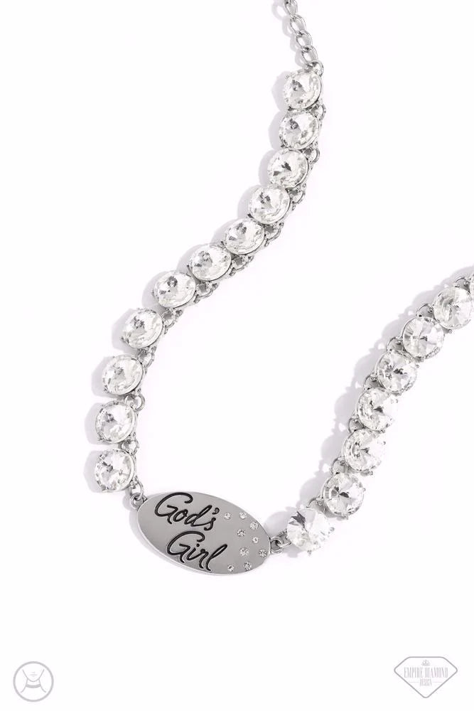Infused along a classic silver chain, a flashy collection of silver-pronged white gems shimmer and shine down the neckline to an oval silver plate. The phrase "God's Girl" is stamped in a curly font on the plate beside a dusting of dainty white rhinestones for an inspirational finish. Features an adjustable clasp closure.
