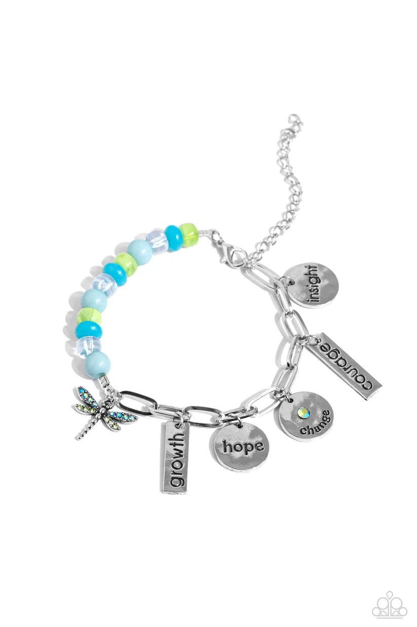 Vivacious Leek Green, turquoise, Skylight, and Waterspout beads in various opacities combine with a strand of silver paperclip links. Featuring the stamped words "growth," "hope," "change," "courage," and "insight," a motley of inspirational charms in circular and rectangular pendants dances alongside a blue and green rhinestone-encrusted dragonfly charm, connecting around the wrist for a hope-filled design. A solitaire blue iridescent gem is featured in the center of the "change" pendant for additional color. Features an adjustable clasp closure. Due to its prismatic palette, color may vary.