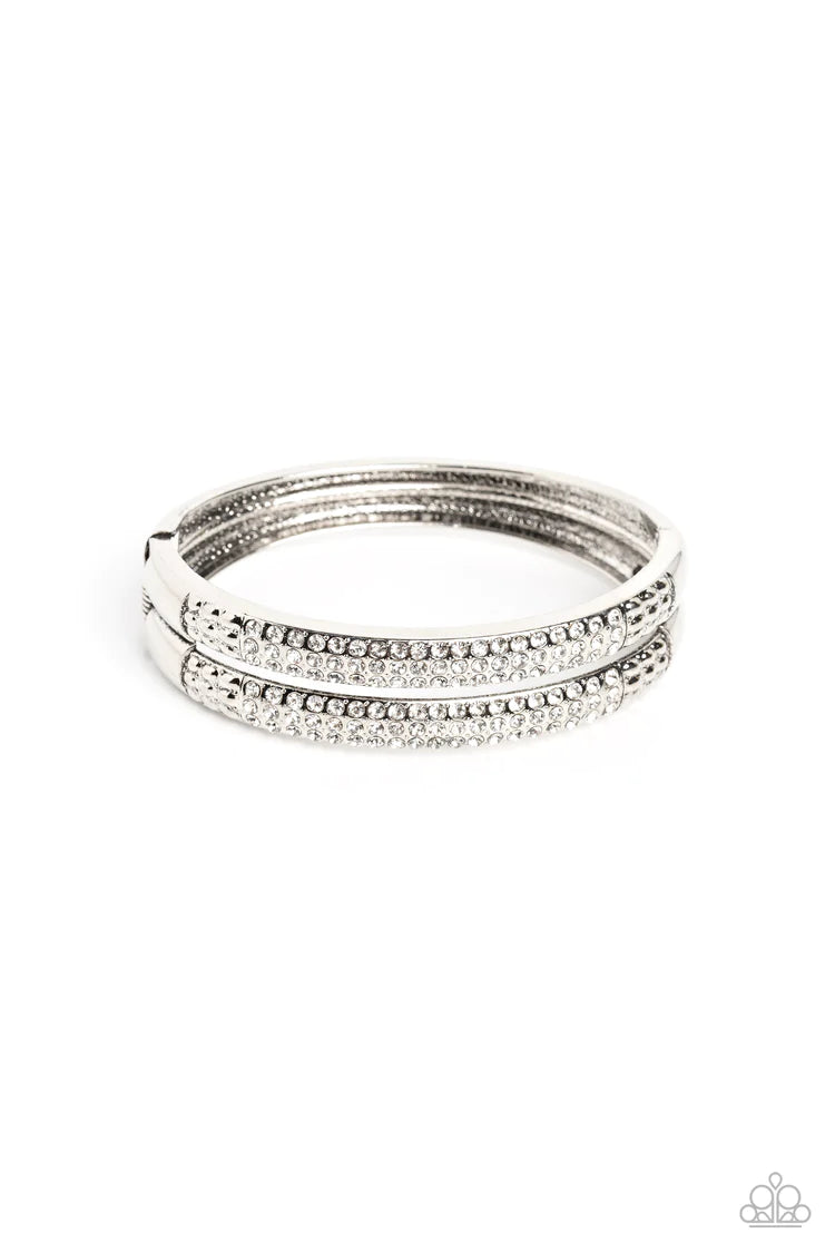 Three rows of dainty white rhinestones are encrusted along two thick silver layers as they stack upon the wrist. Rows of studded silver in a dot-motif border the glittery design for additional texture on the industrial showstopper. Features a hinged closure.