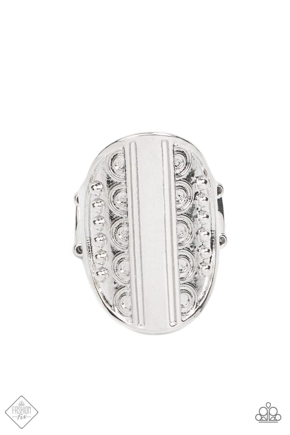 An oval shaped disc is divided down the center by a smooth band of silver. Silver studs and embellished texture are mirrored on either side of the divide as the band curves across the finger for an understated yet timeless finish. Features a stretchy band for a flexible fit.