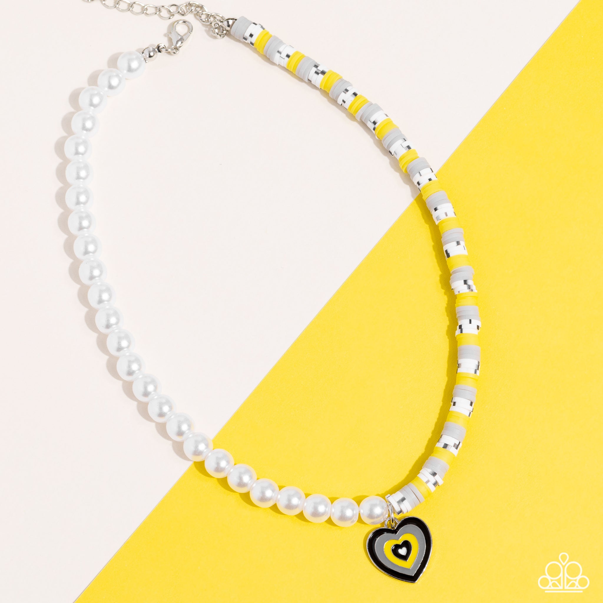 A strand of gleaming white pearls and clay discs in shades of gray, yellow, and white striped with black combine to create a half-and-half fashionable mashup down the neckline. A heart pendant painted with bands of black, gray, yellow and white hangs from the colorfully refined pearl and clay chain for a carefree whimsical finish. Features an adjustable clasp closure.