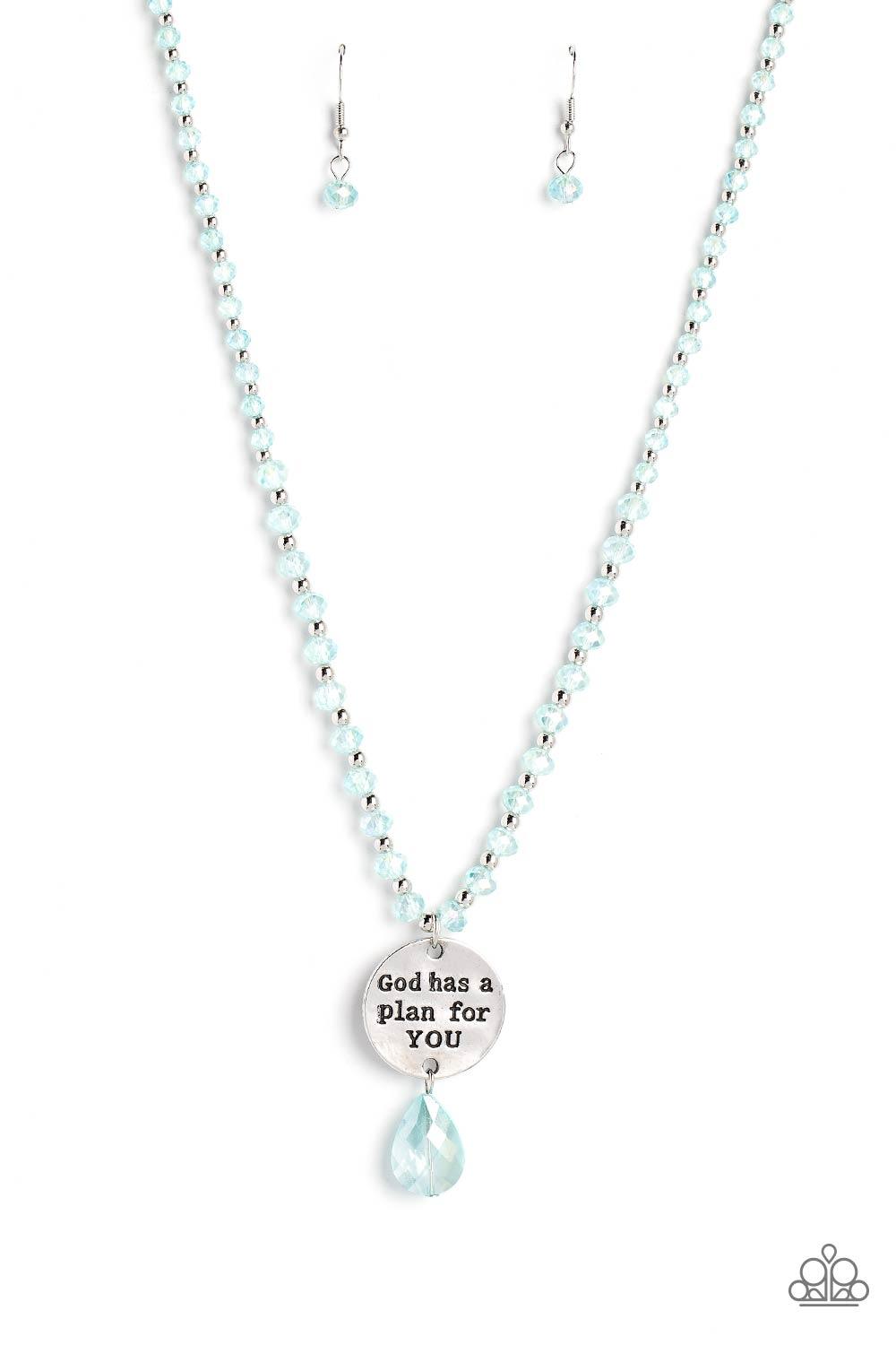 Infused along an invisible wire, silver studs and reflective light blue, faceted beads glide down the chest in a shimmery style. Hanging from the bottom of the beads and studs, a hammered silver disc is stamped with the phrase "God has a plan for YOU" with a reflective, blue faceted teardrop bead adding additional swing to the divine design. Features an adjustable clasp closure.