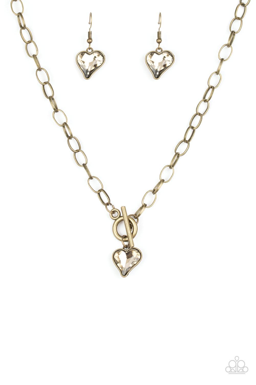 Cut into a whimsical heart shape, a glittery golden gem swings from the bottom of a glistening brass chain below the collar for a charming look. Features a toggle closure.