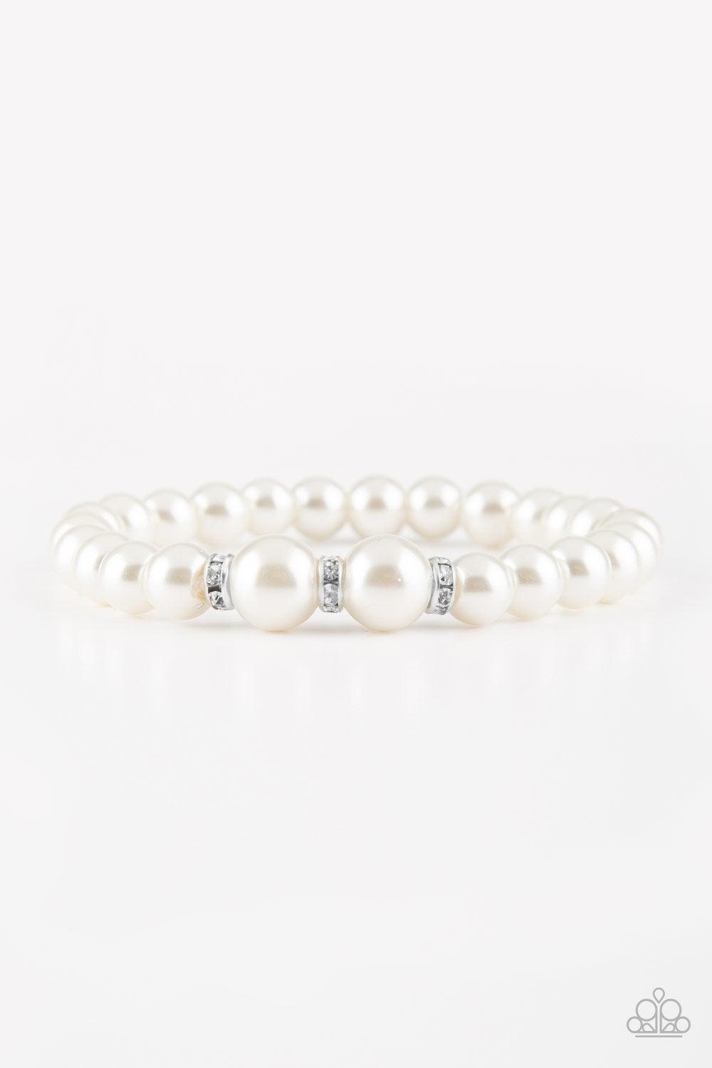 Gradually increasing in size near the center, luminescent white pearls are threaded along a stretchy elastic band. White rhinestone encrusted rings are sprinkled along the pearls for a timeless finish.