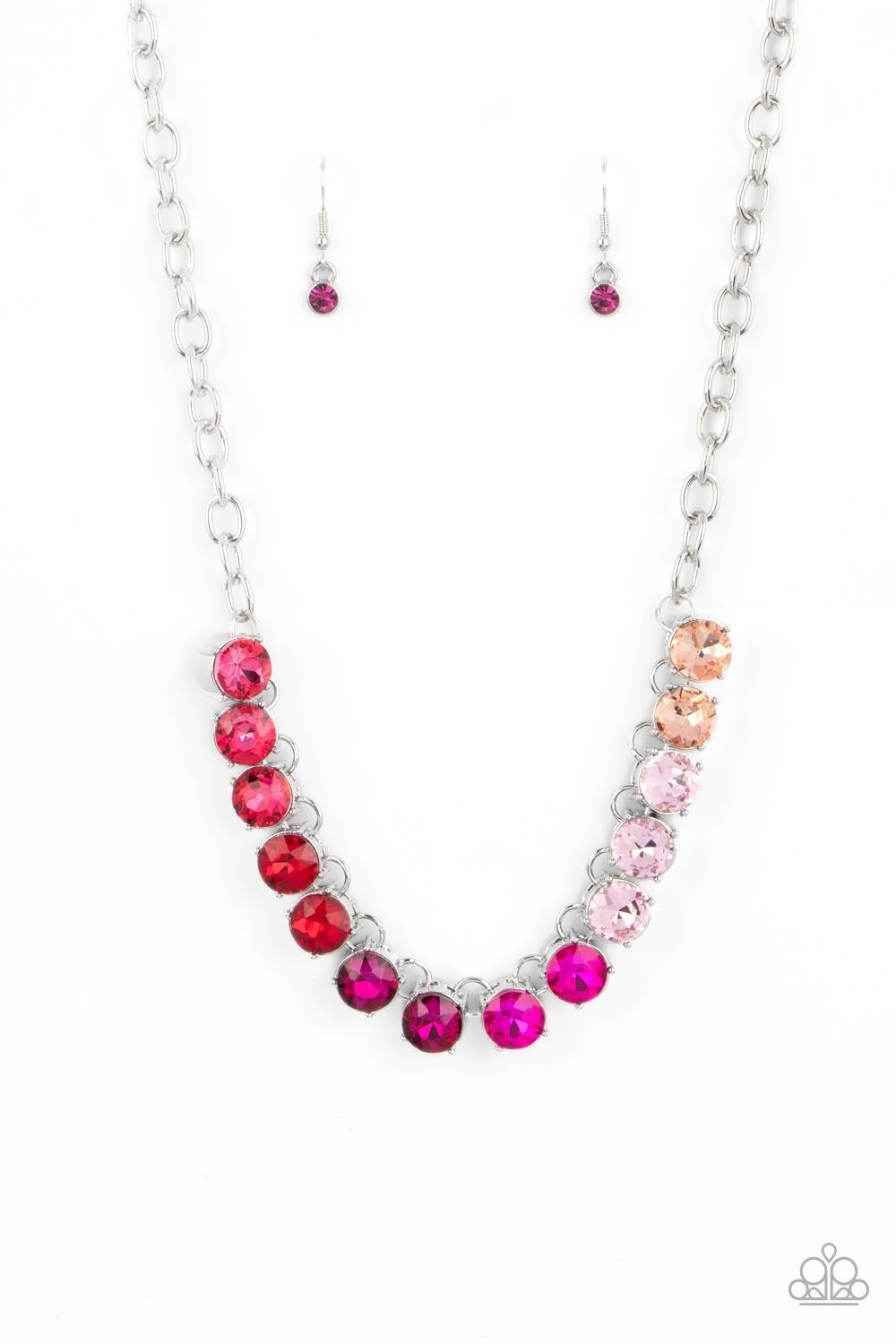 Set in bold silver fittings, a rainbow of oversized rhinestones in varying shades of pink sparkles below the collar for an out-of-this-world statement. Features an adjustable clasp closure.