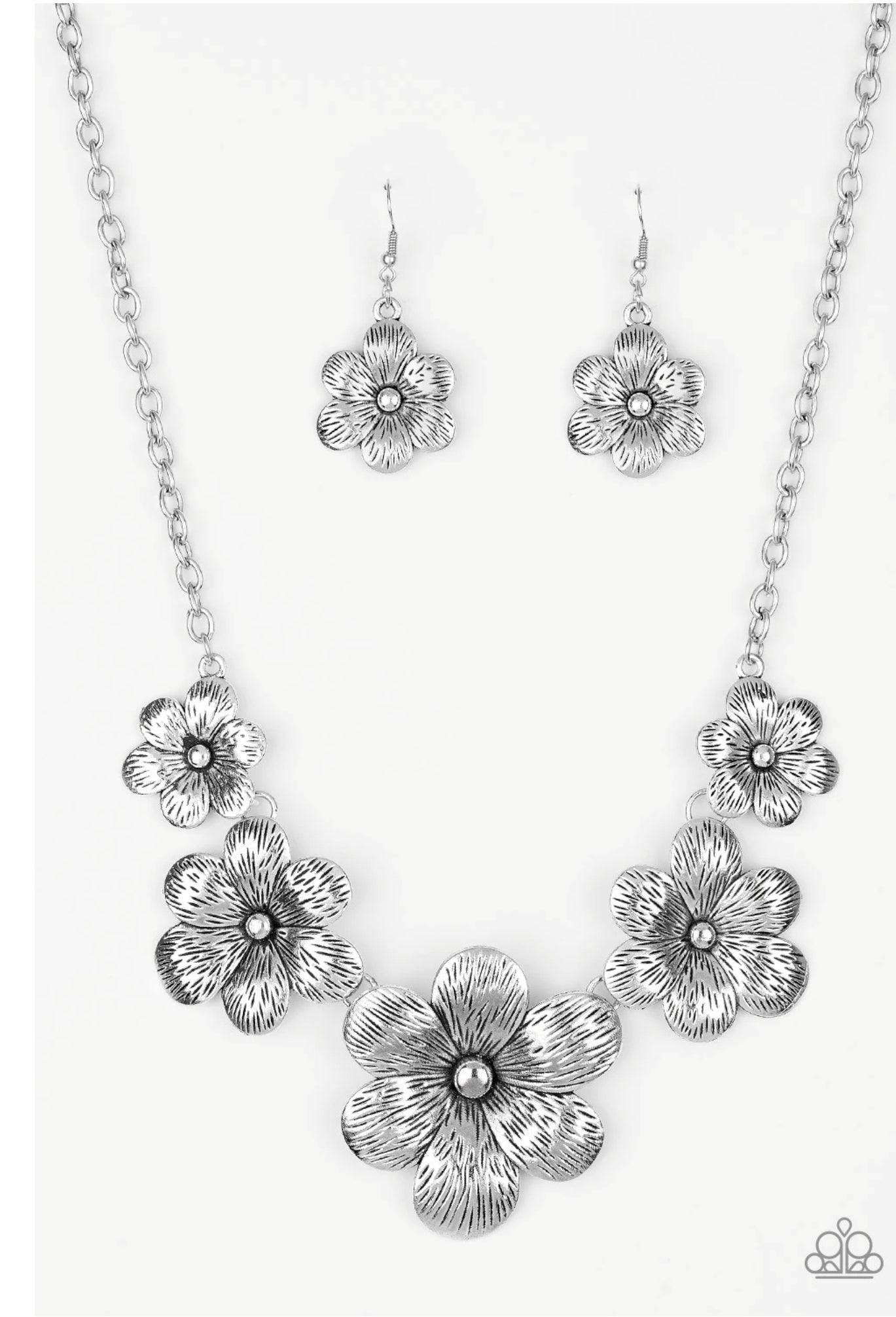 Brushed in an antiqued shimmer, lifelike silver flowers gradually increase in size as they link below the collar in a seasonal fashion. Features an adjustable clasp closure.