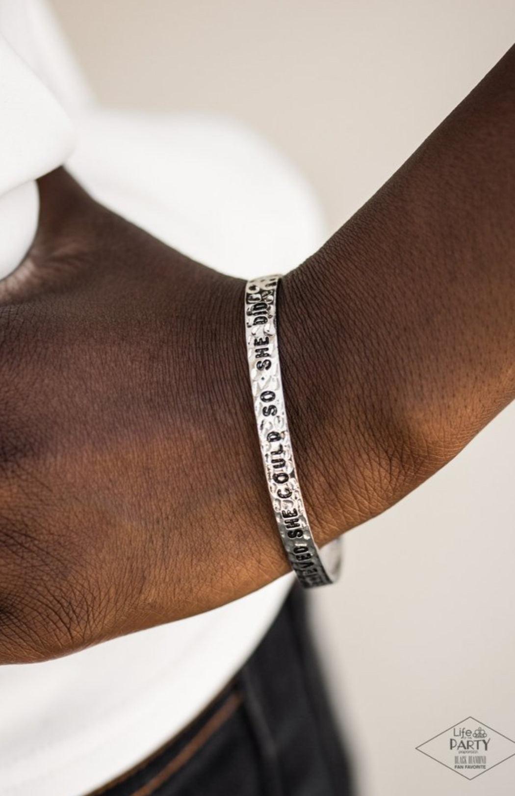 A silver cuff wraps around the wrist in a bright and casual fashion. Painted in a black hue, the phrase “She believed she could so she did” runs horizontally across the cuff for an inspirational finish.