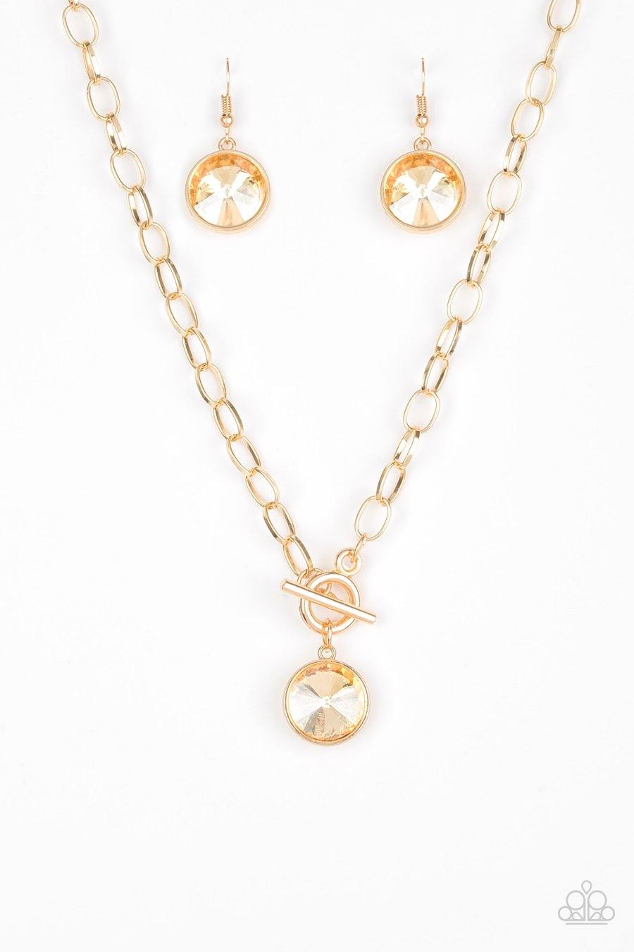 A dramatic golden gem swings from the bottom of a shiny gold chain, creating a blinding pendant below the collar. Features a toggle closure.