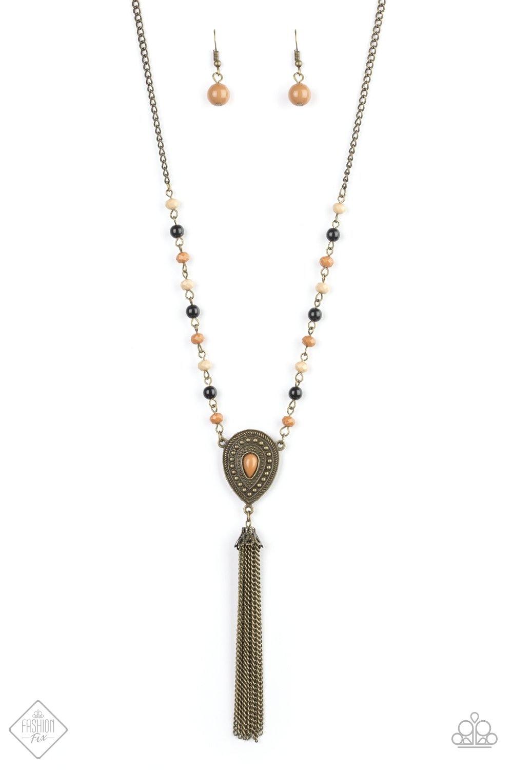 Polished black beads and faceted Almond Buff and Meerkat beads trickle along a brass chain, giving way to an antiqued teardrop pendant. Infused with studded detail and a matching Meerkat beaded center, the ornate pendant is decorated in a brass chain tassel for a wanderlust finish. Features an adjustable clasp closure.