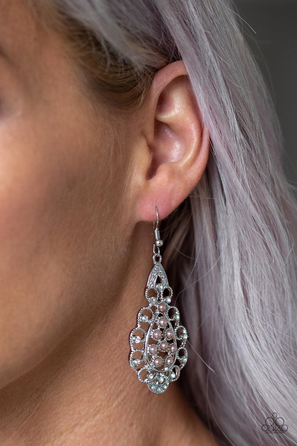 Dotted with glassy white rhinestones, elegant silver filigree curls around a brown pearl dotted center for a regal look. Earring attaches to a standard fishhook fitting.