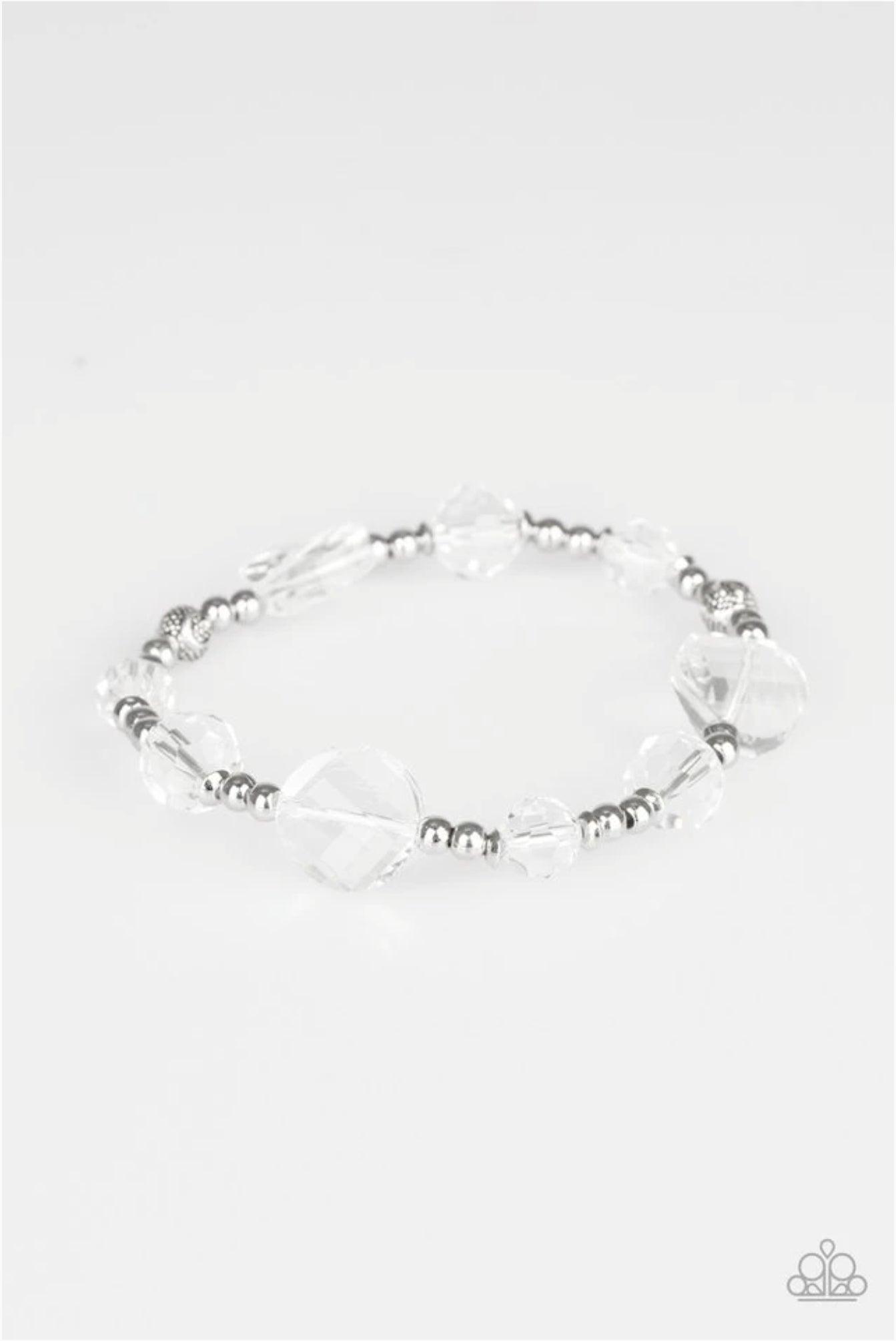 A collection of glittery white beads and shiny silver beads are threaded along a stretchy band around the wrist for a refined look.