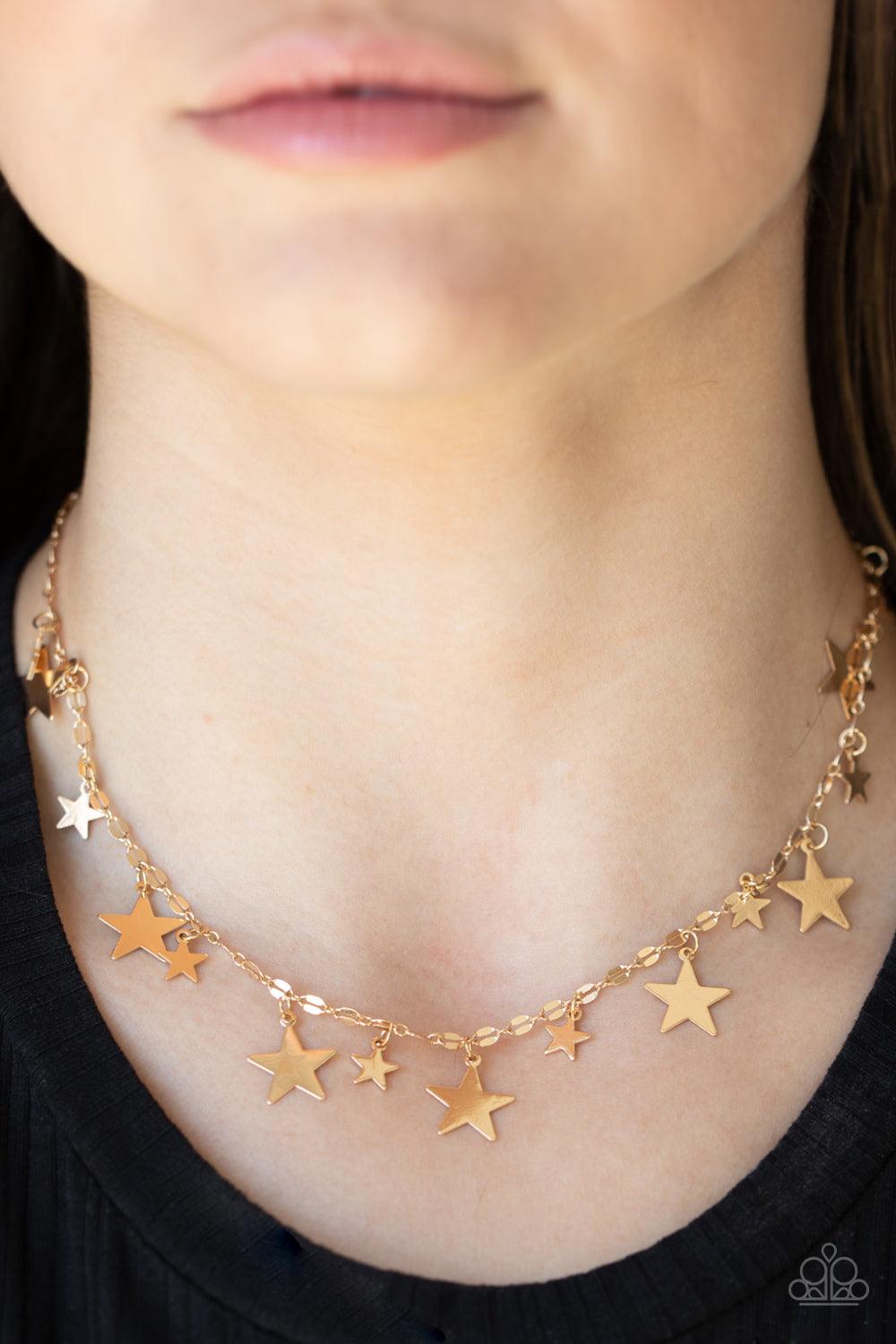 Varying in size, dainty shiny gold stars alternate along decorative gold chain, creating a stellar fringe below the collar. Features an adjustable clasp closure.