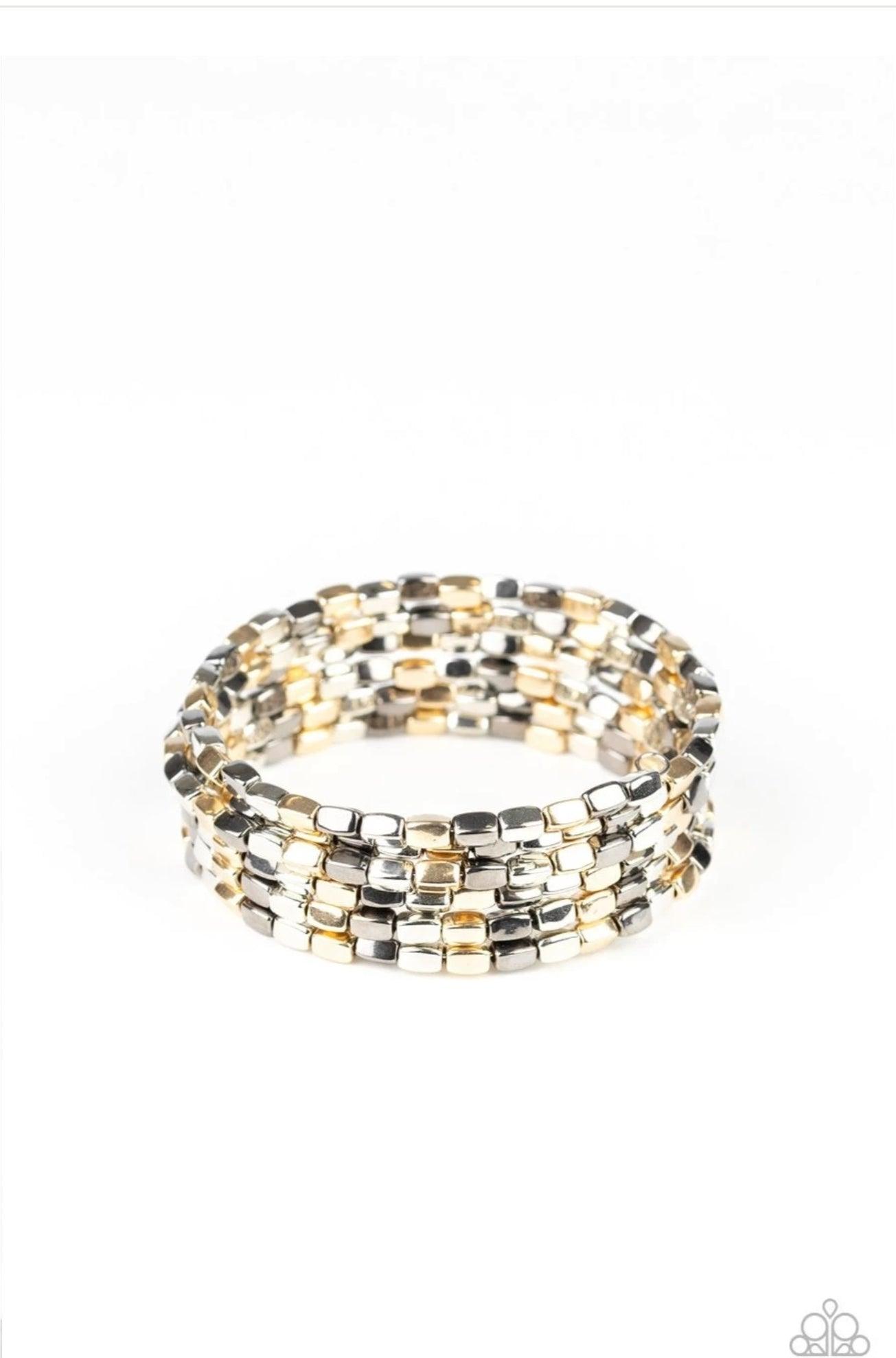 A glistening collection of rectangular gold, gunmetal, and silver beads are threaded along a coiled wire, creating a shimmery infinity wrap style bracelet around the wrist.