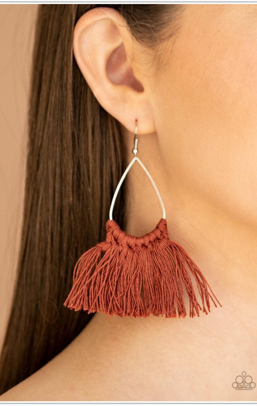 Cinnamon Stick threaded tassels knot around the bottom of a shimmery silver teardrop frame, creating a spicy fringe. Earring attaches to a standard fishhook fitting.