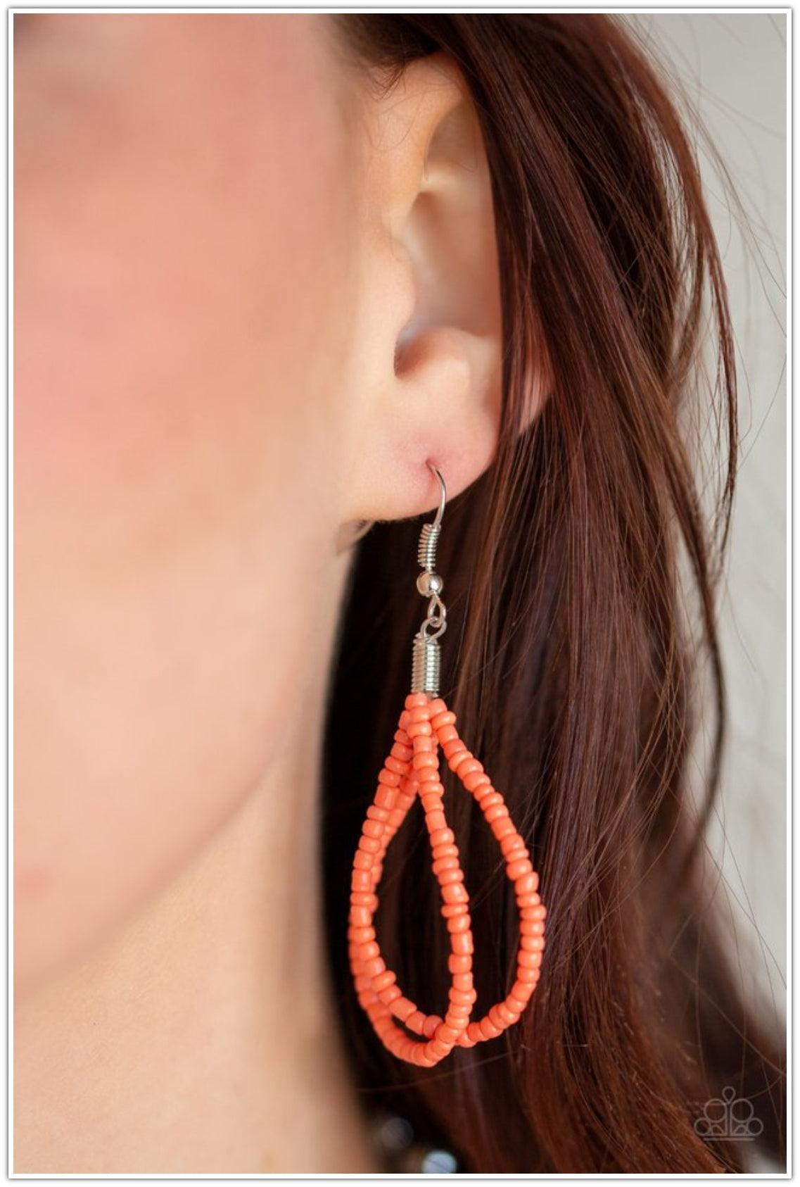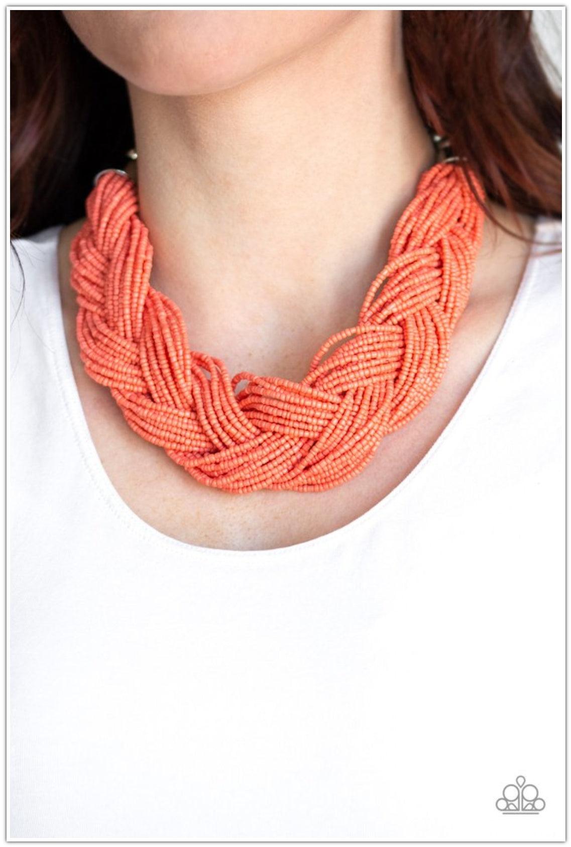 Brushed in a refreshing coral hue, countless seed beads weave into an indigenous braid below the collar. The colorful strands attach to large silver beads, adding a hint of metallic shimmer to the playful design. Features an adjustable clasp closure.